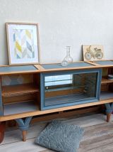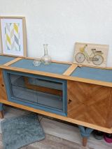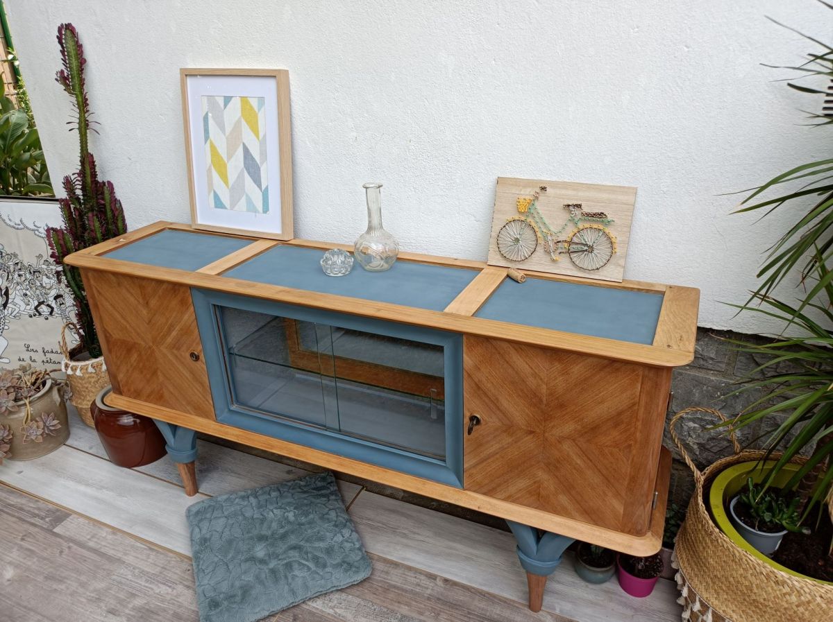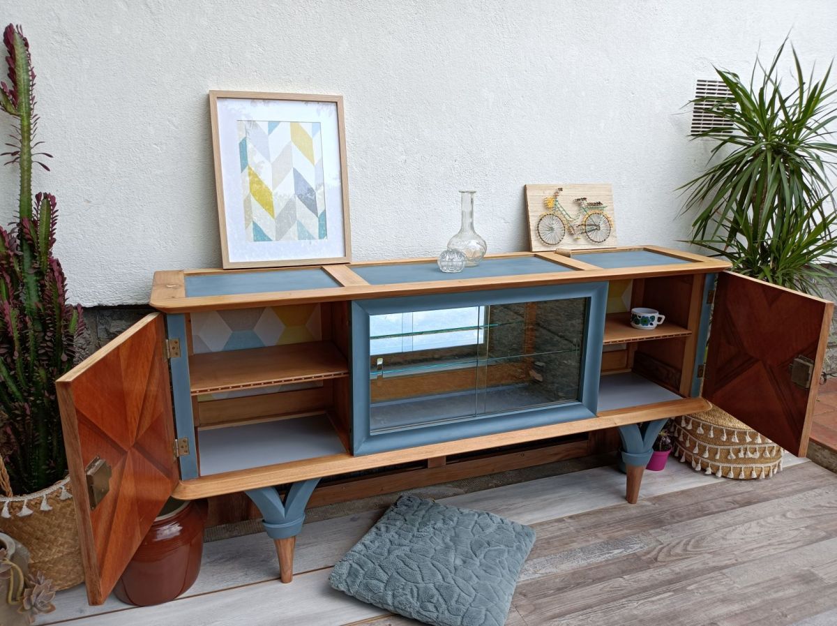 Le papier peint du fond du meuble affirme le coté vintage de cette enfilade.