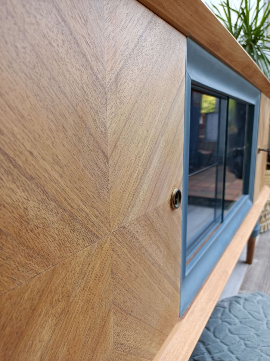 Meuble en chêne, aux belles portes marquetées et à l’allure scandinave.