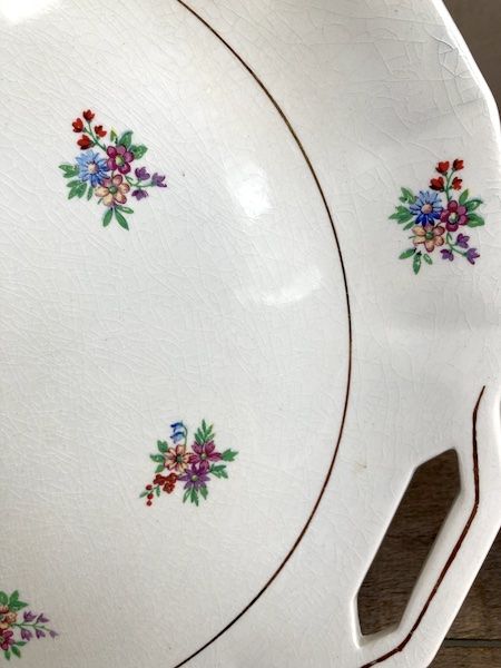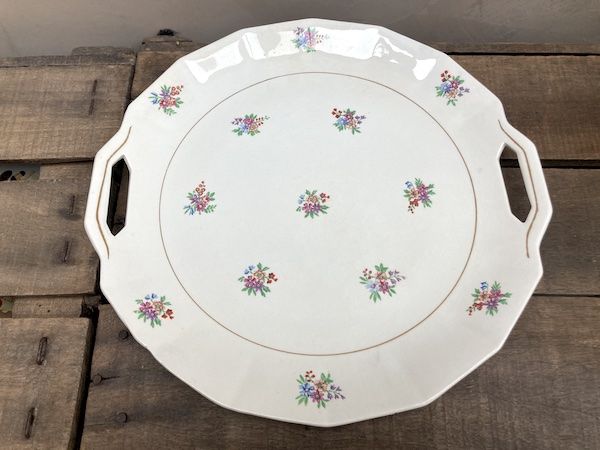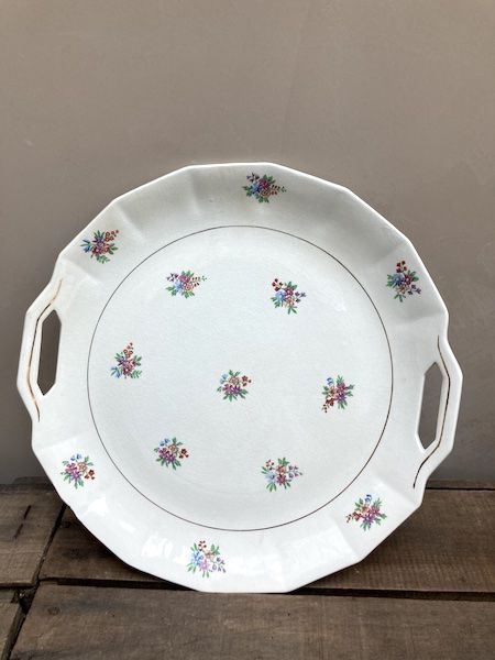 Plat à tarte Porcelor Ceranord avec ses deux petites anses caractéristiques. Décor composé de petites fleurs roses et d'un liseret doré.