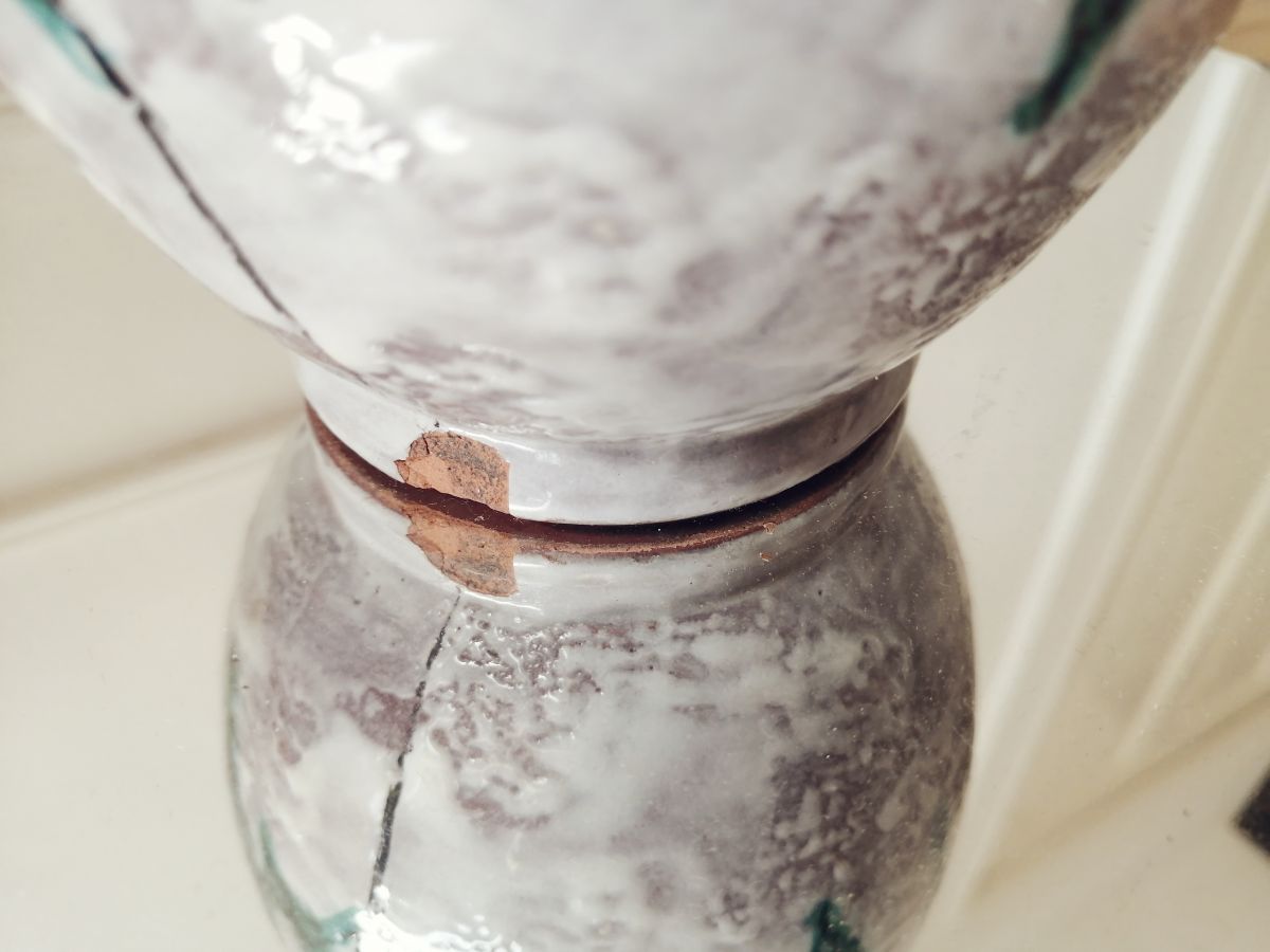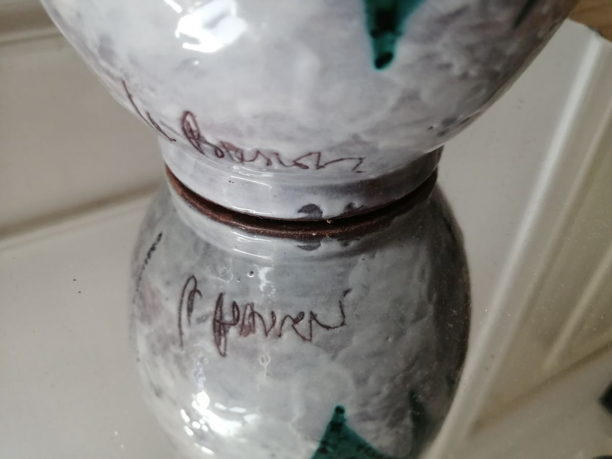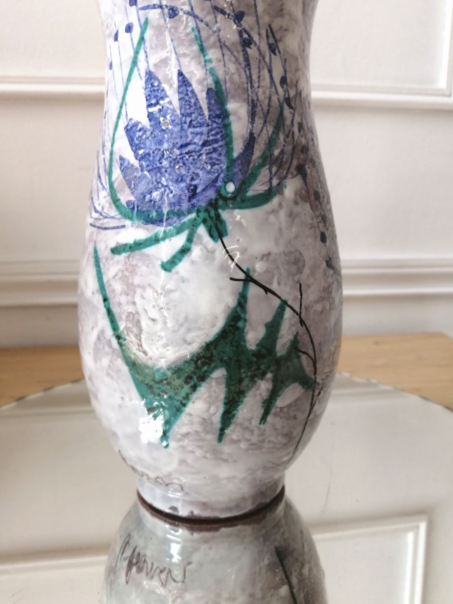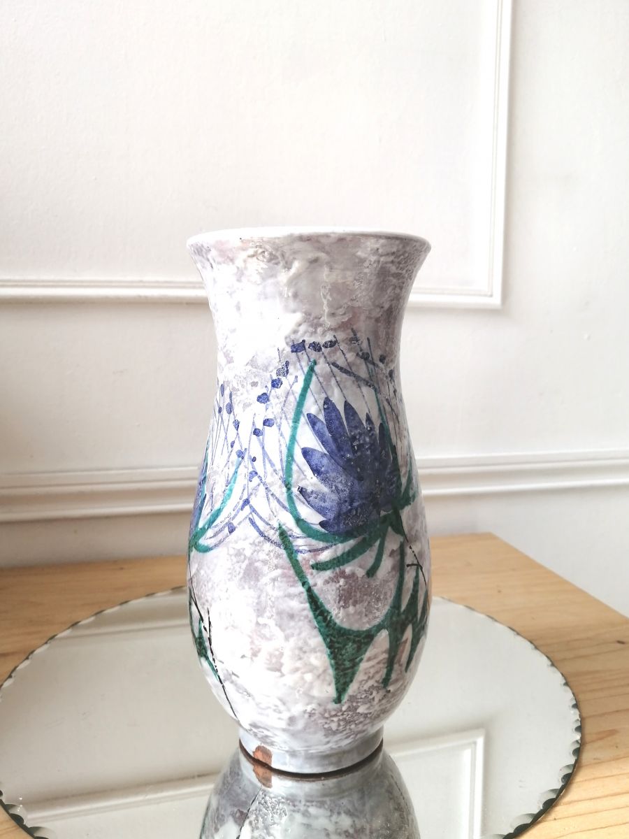 Très beau vase des années 50 aux tons résolument modernes. Décor de chardons très stylisés. Signé '' Le Brescon''. Un mini éclat sur la base mais rien de grave.