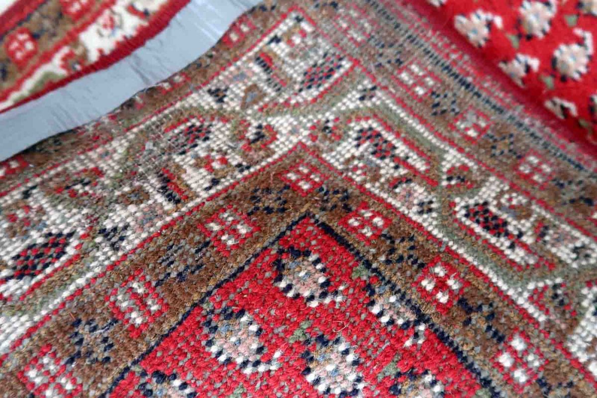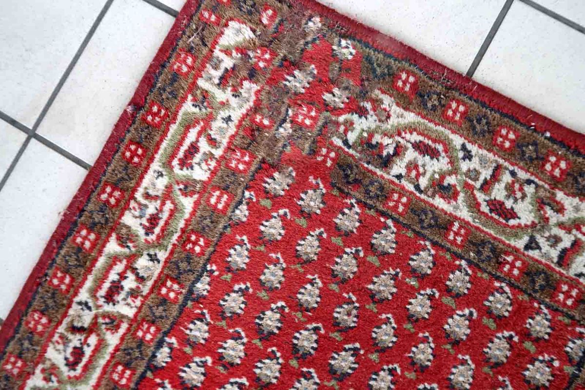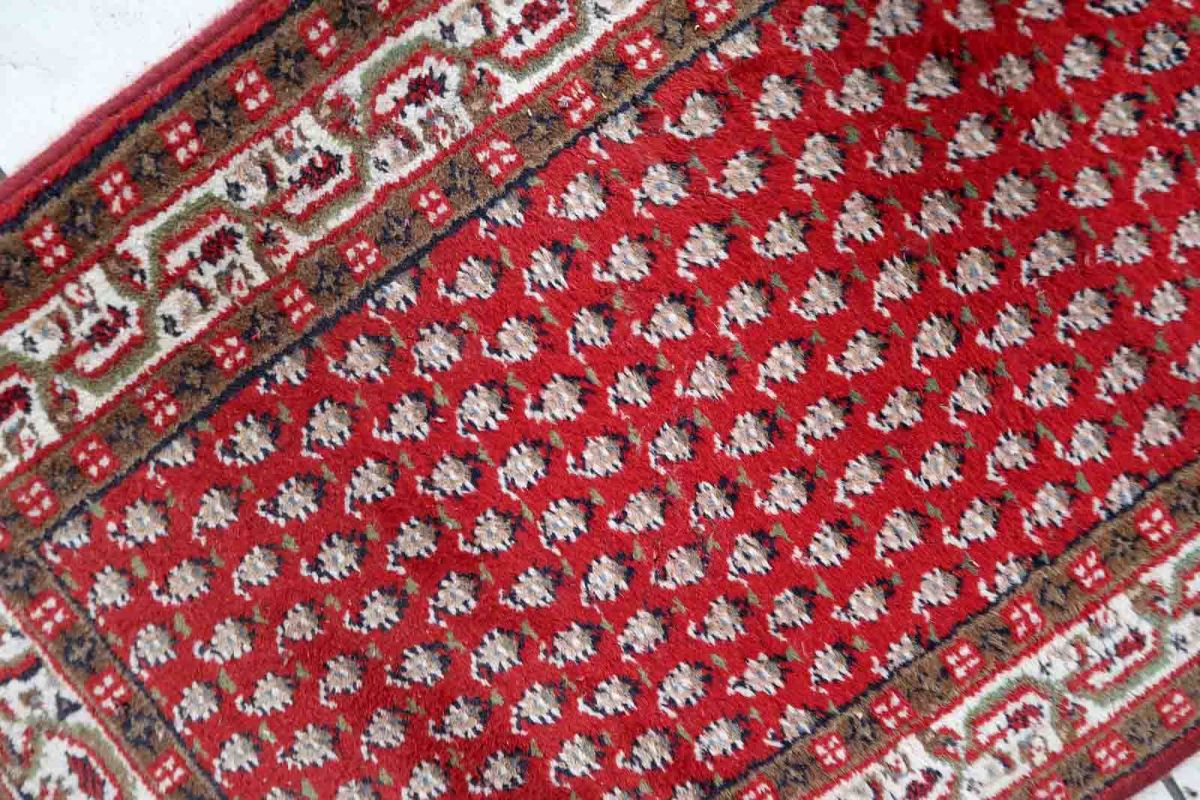 Handmade vintage Indian Seraband rug in red color and all-over design. The rug has been made in the end of 20th century. It is in good condition, has some signs of age.