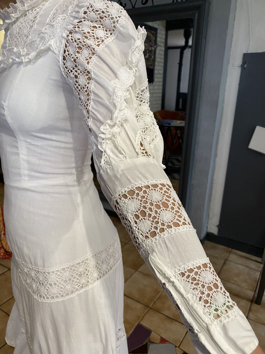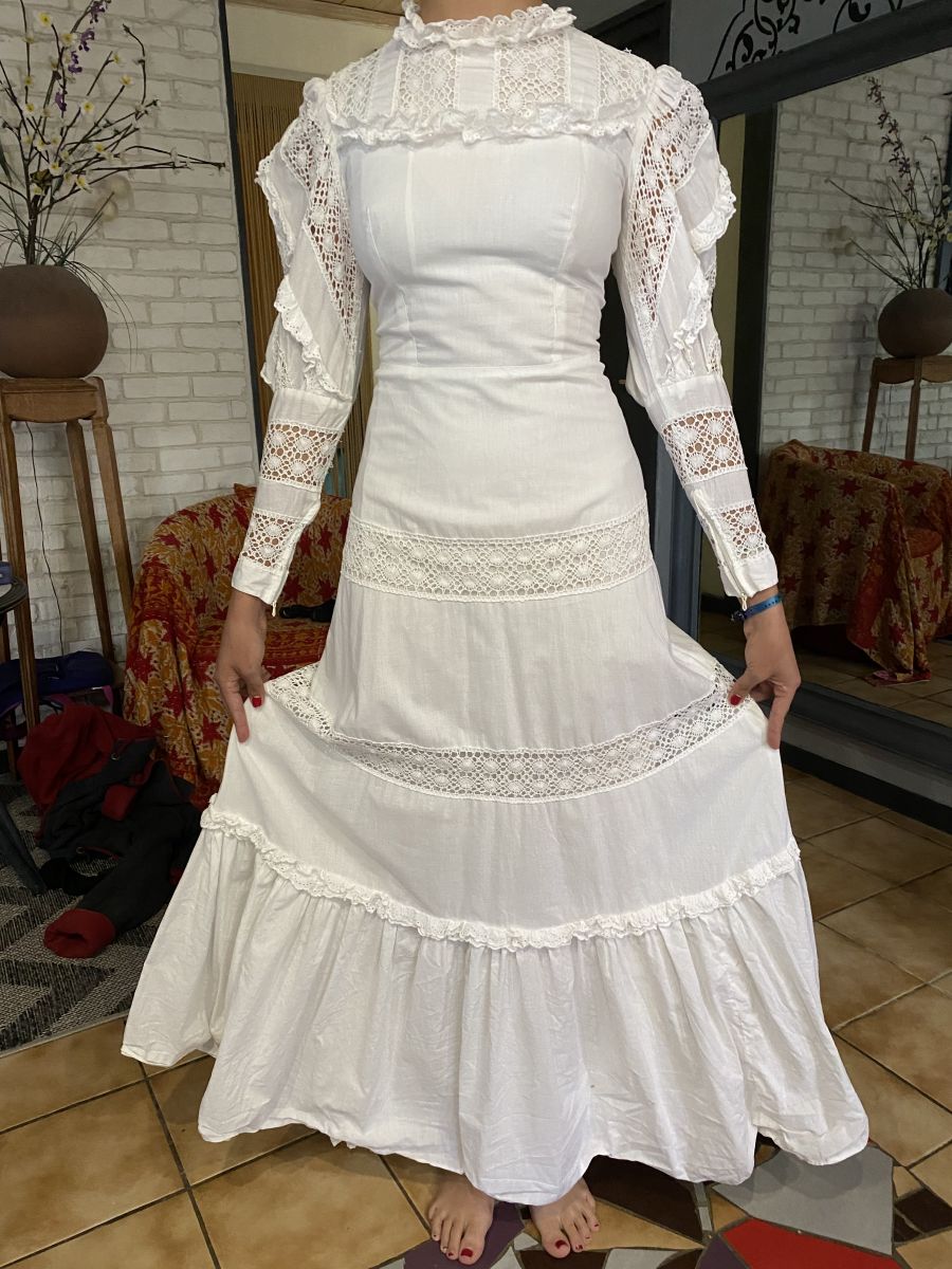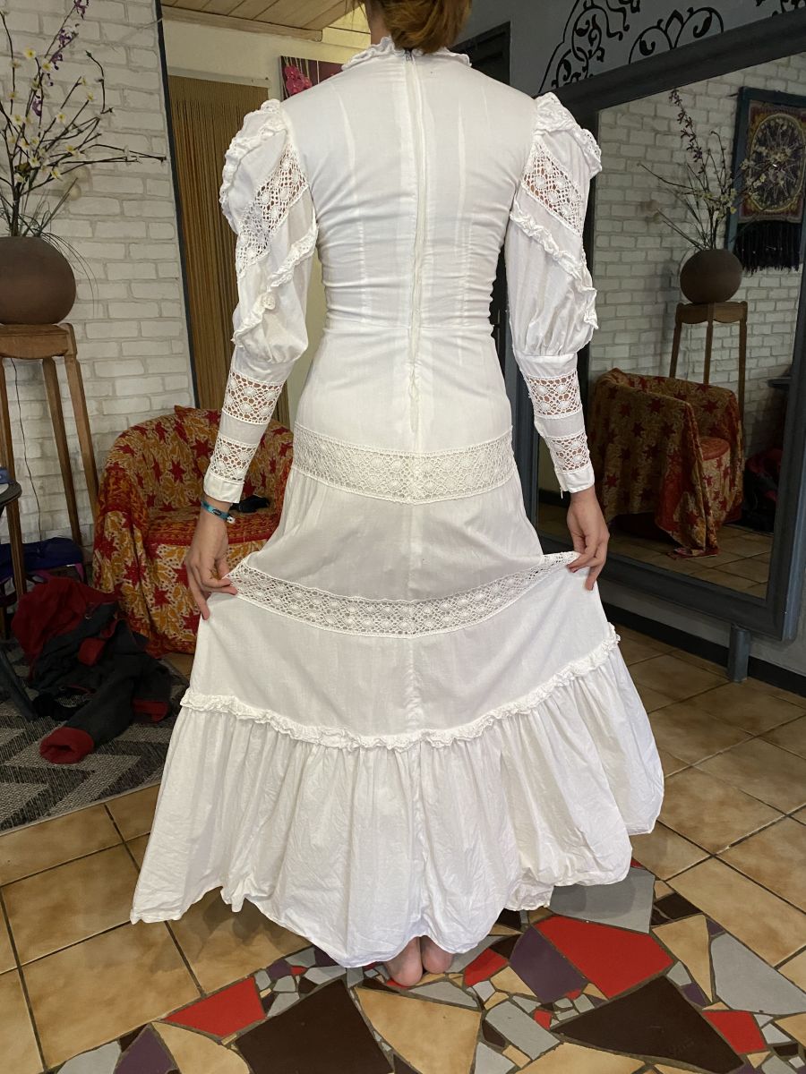 Taille 38 cintrée de couleur blanche utilisée une fois (mariage) en 1976. Manches bouffantes resserrées aux poignets par une fermeture éclair