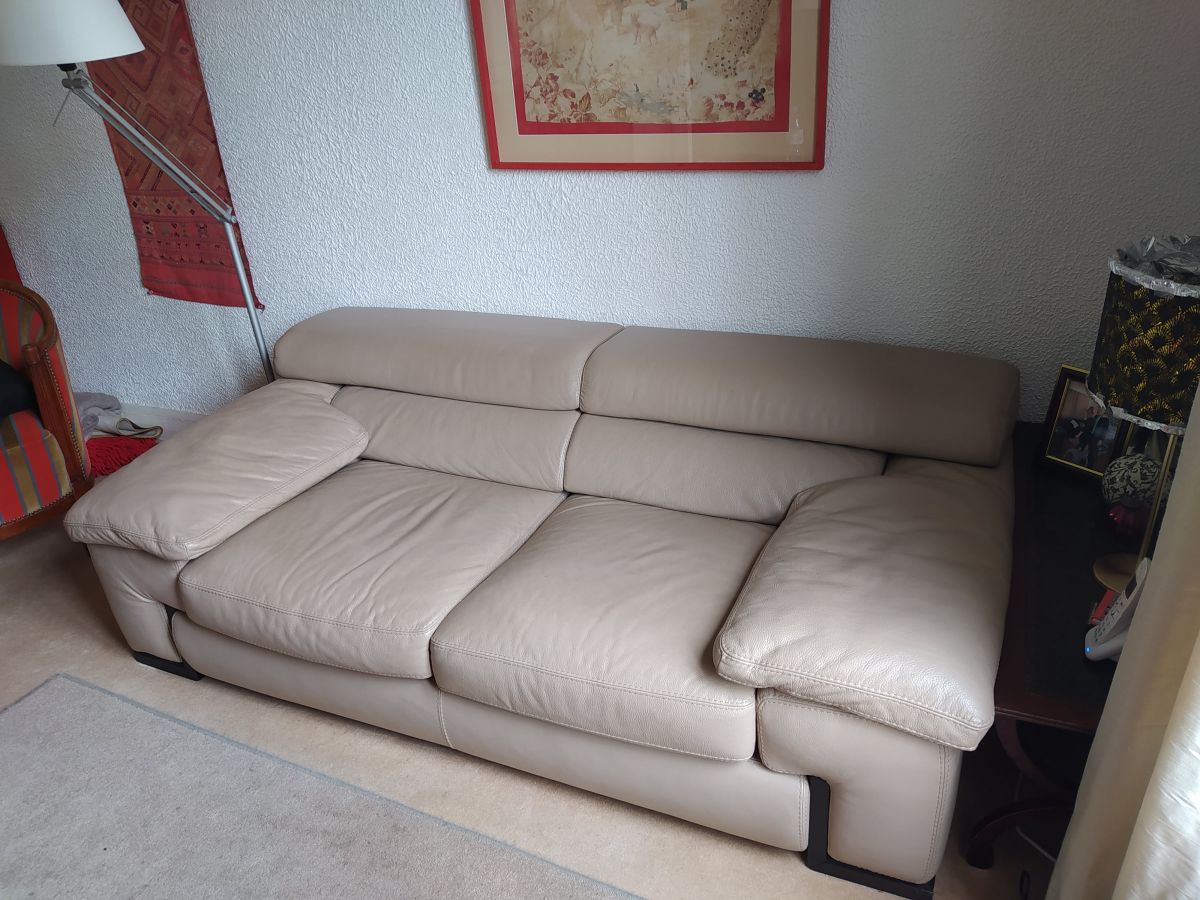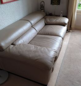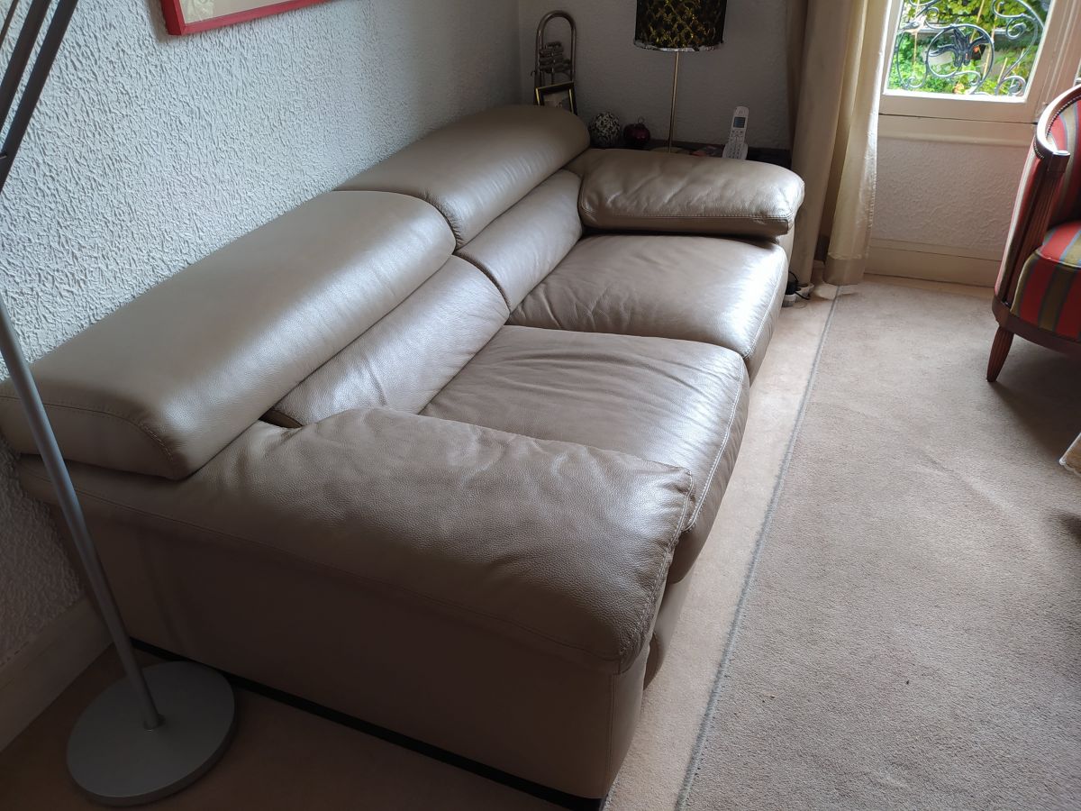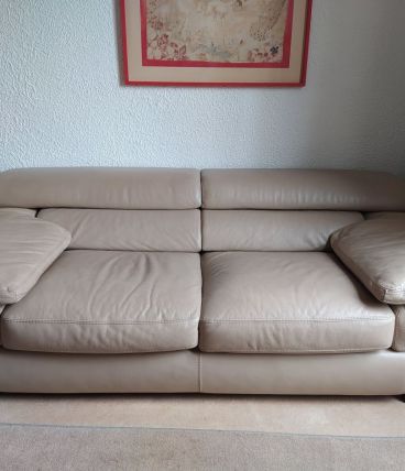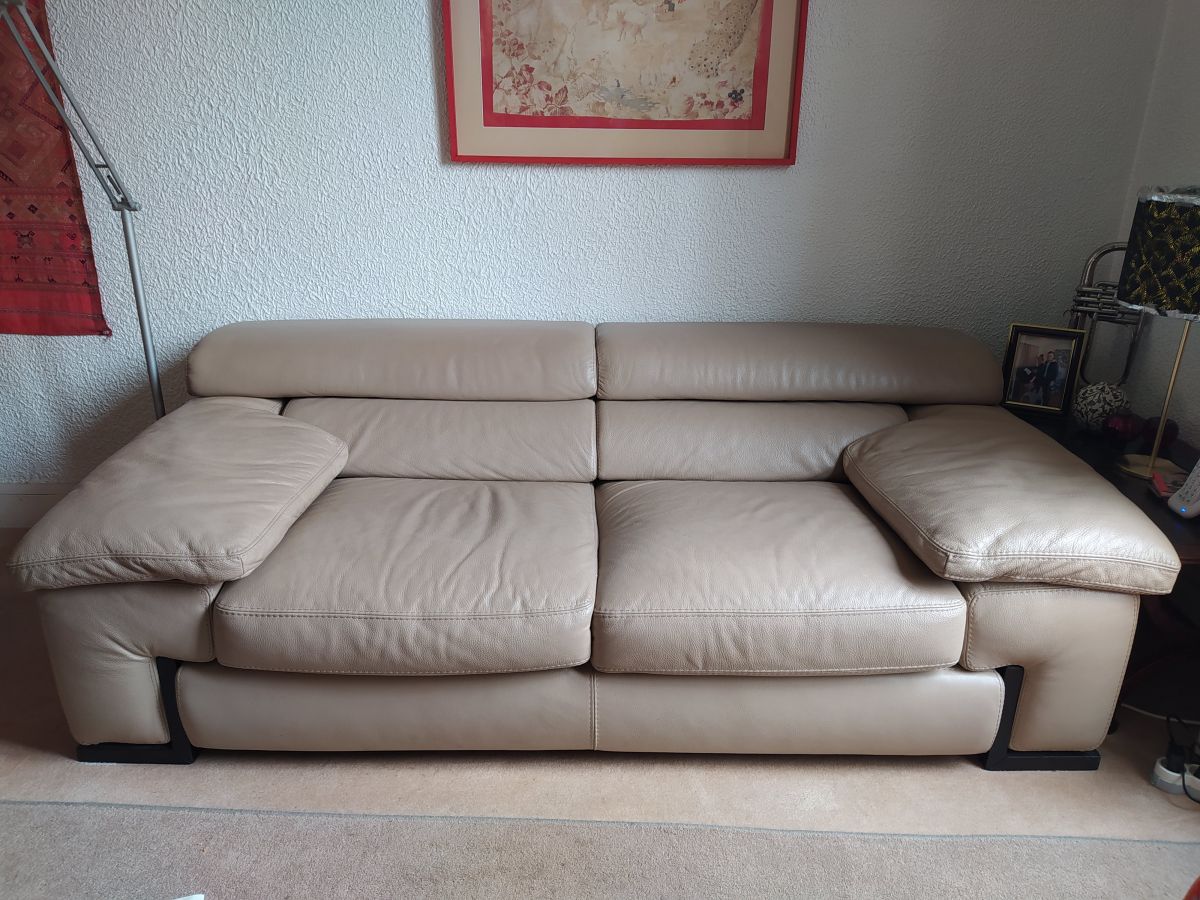 Canapé en cuir de vachette roche & bobois, couleur tourterelle. Modèle vivalto, deux places l191 X h55 X p109. Canapé en très bon état recouvert de cuir de vachette avec pieds en hêtre massif teinté.