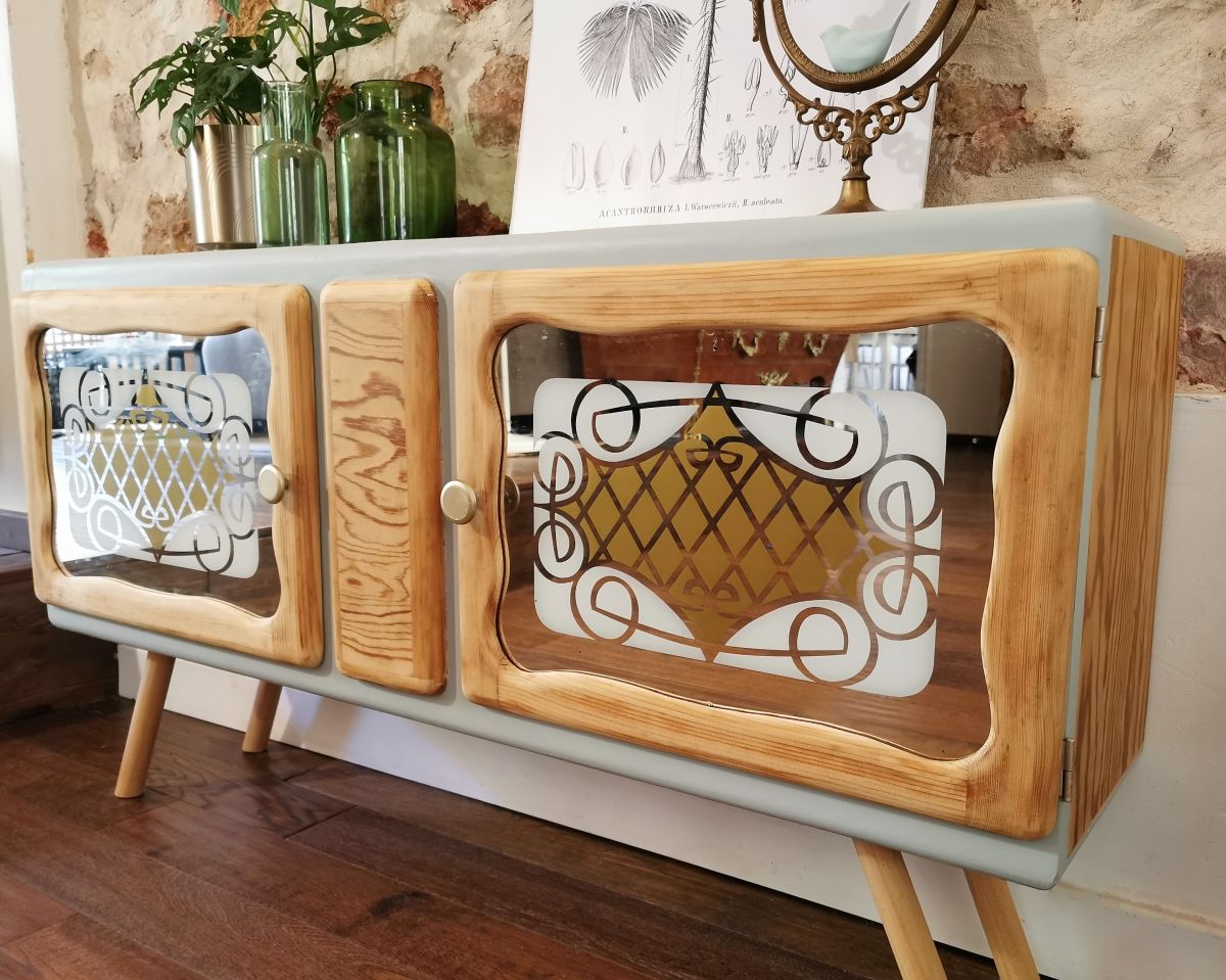 Upcycling d'un meuble ancien avec son charme et sa patine et ses portes en miroir parfaitement rétro.