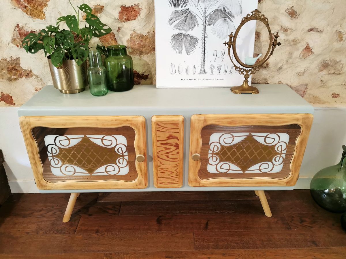 Ce meuble vintage est une création unique et originale, il présente de petits signes du temps qui font son charme. Sa couleur vert d’eau lui donne du cachet et se marie avec toutes les inspirations.