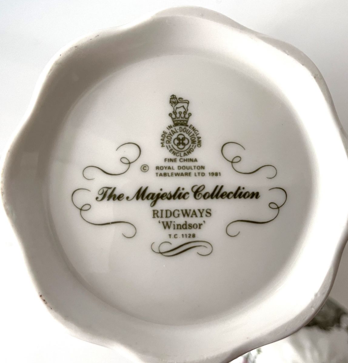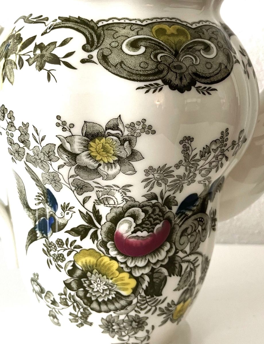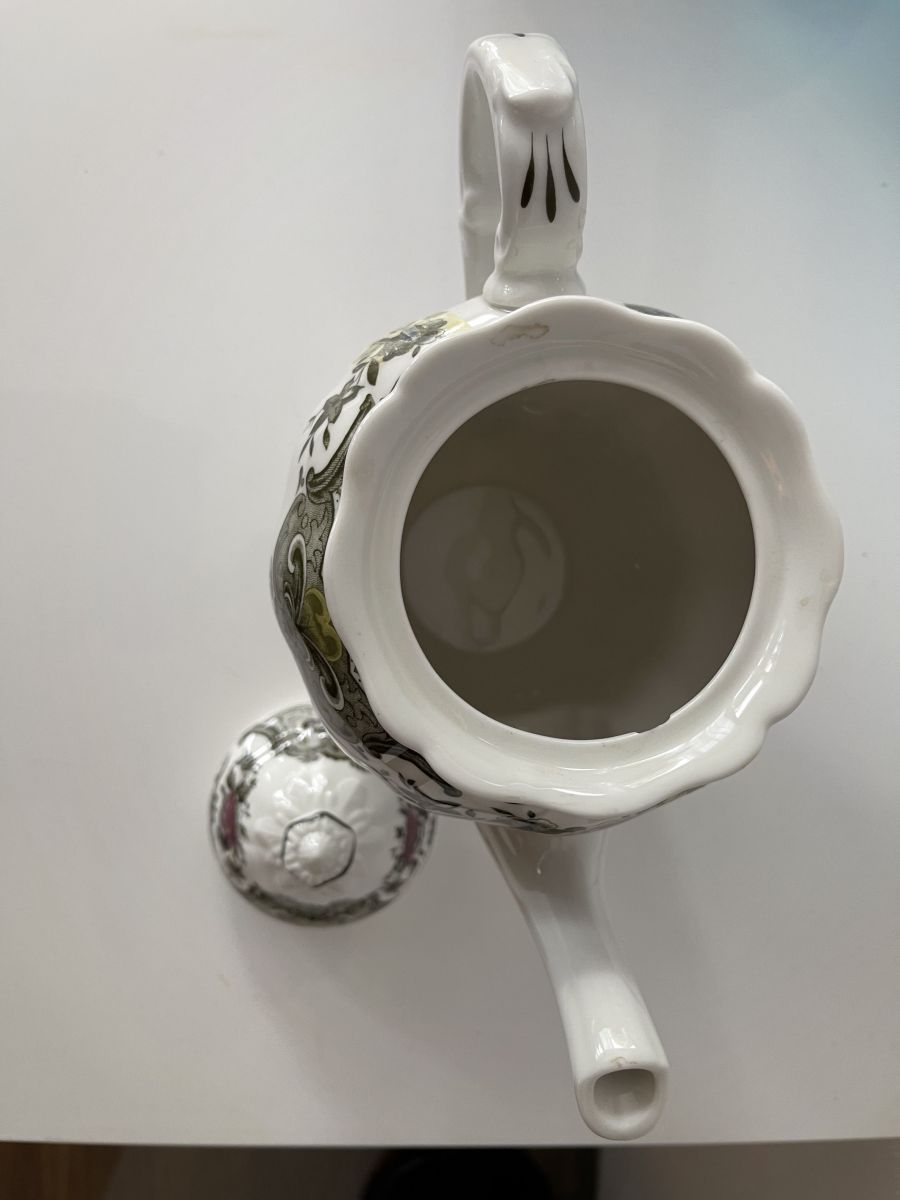 Trés élégante théière en porcelaine fine, majestic collection ridgways windsor.motifs de fleurs et végétaux et oiseaux dans les tons verts, jaune et quelques touches de parme.produite par la manufacture de porcelaine anglaise royal doulton.cette manufacture fut créee en 1815 et a également fabriqué les lavabos du titanic (1912). Cette théière estampillée „the majestic collection ridgway windsor“ en parfait état. Aucune rayure ni manque. Une pièce exceptionnelle pour collectionneurs et passionnés. Hauteur 24 cm// largeur 25 cm (anse comprise) // profondeur 14 cm// poids 0, 7 kg: emballage et livraison soignés par DHL