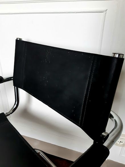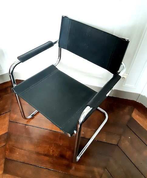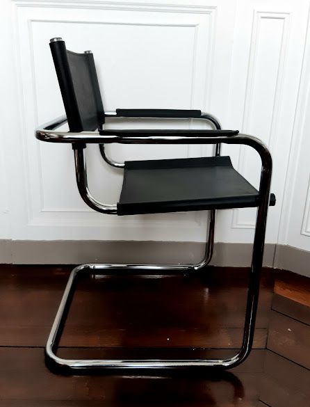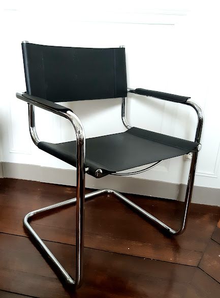 Ce siège à la ligne épurée, présente une structure tubulaire métallique chromée. Le dossier, l’assise et les manchettes d’accoudoirs sont garnis d’un cuir noir en excellent état. Il est piqué à point sellier, technique de couture à deux aiguilles, très appréciée car des plus solides.