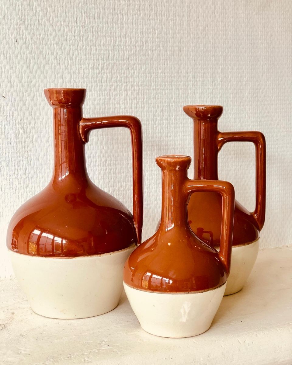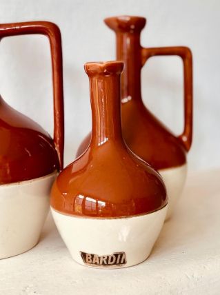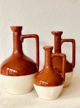 Lot de 3 cruchons de la distillerie bordelaise bardinet. Années 60, cruchons à rhum ! Grès vernissé, glaçage lisse d’une belle couleur caramel et crème. Chaque cruchon est signé. 3 modèles: 100 cl 75 cl et 37 cl.