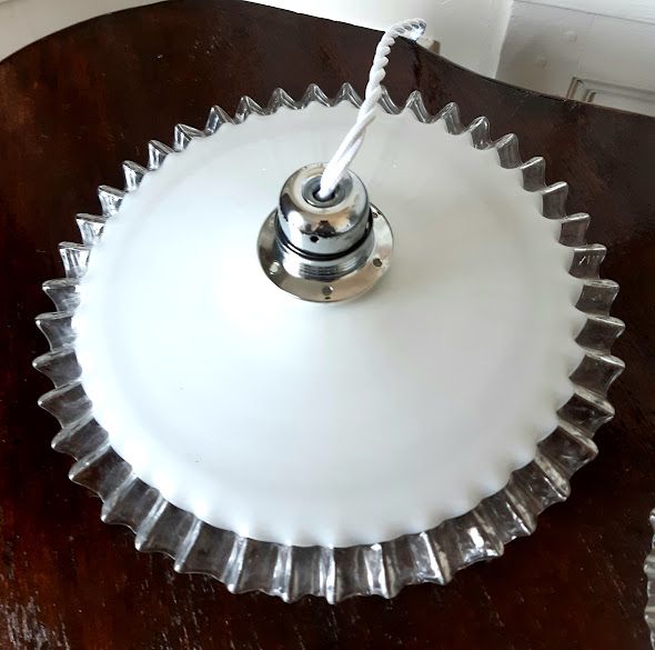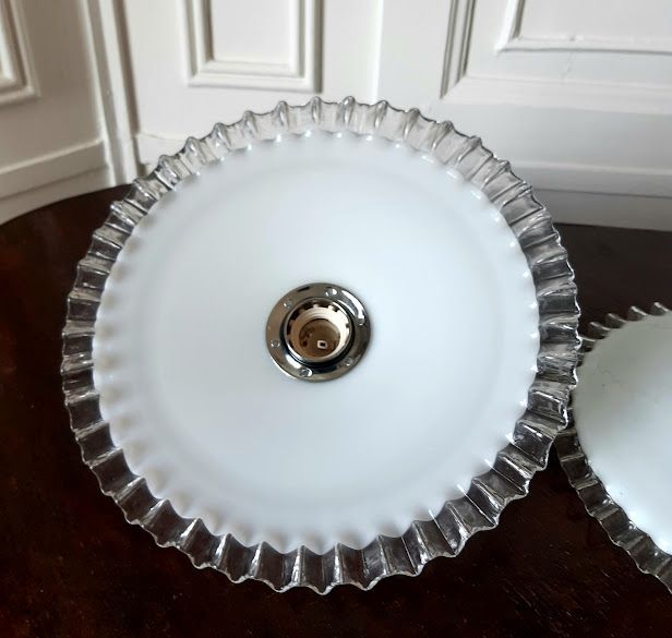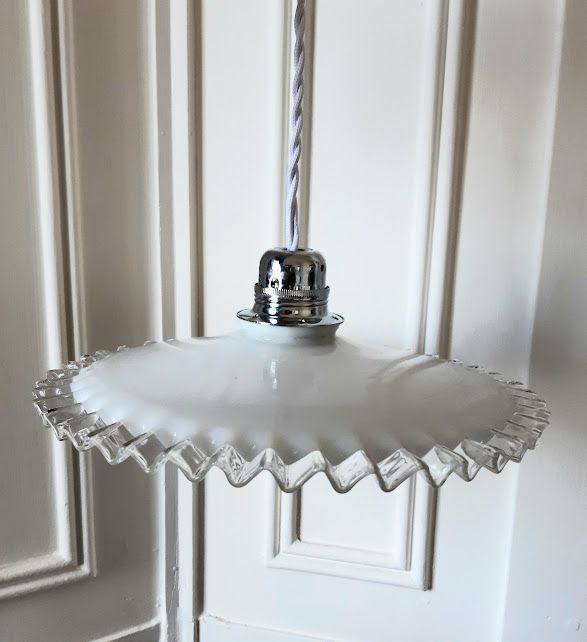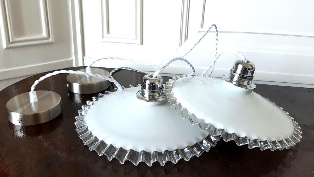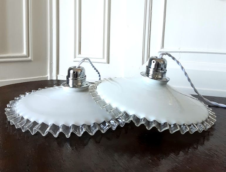 Paire de suspensions en opaline blanches vintages au bord dentelé, montées à l'électricité.