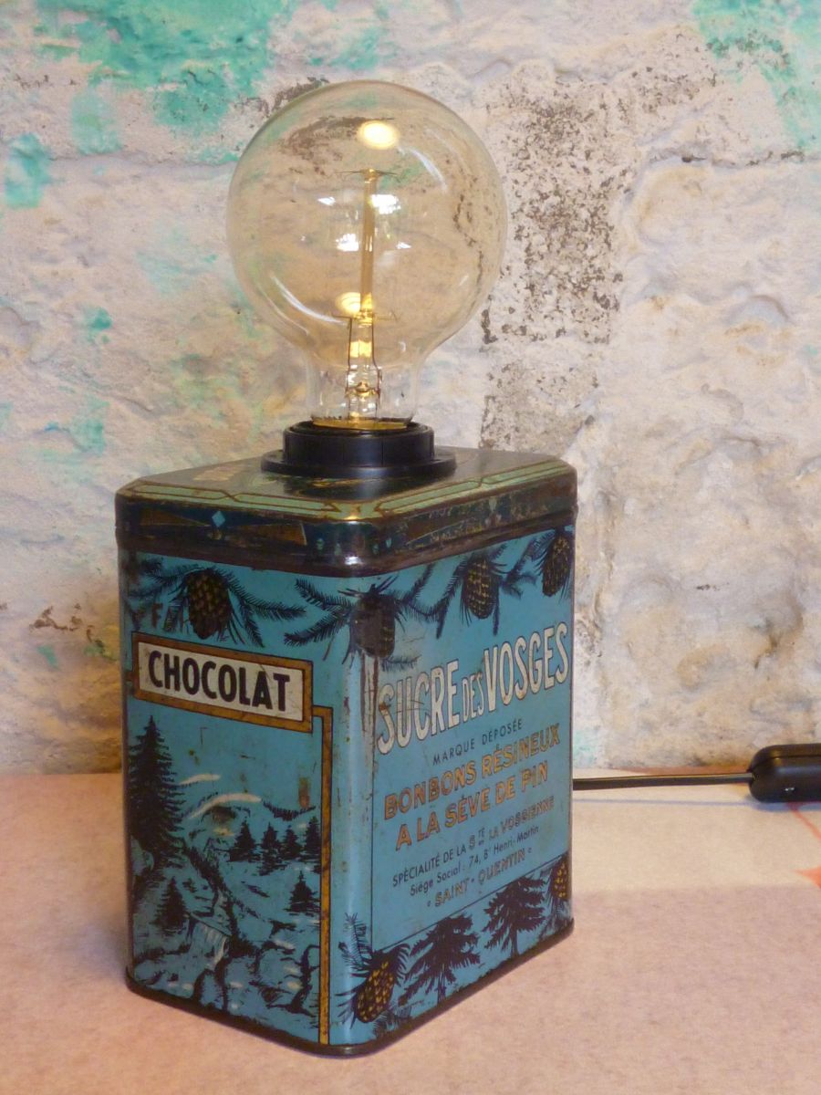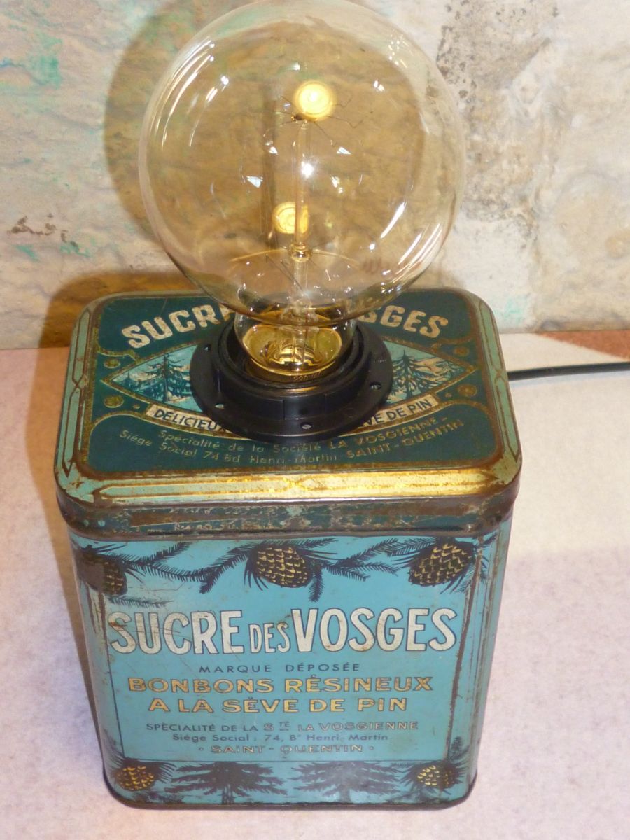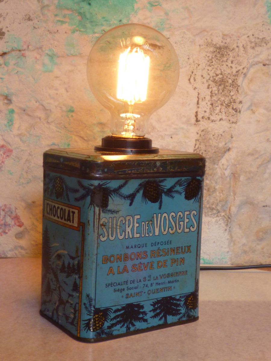 Lampe réalisée a partir d'une ancienne boite publicitaire en tole " CHOCOLAT - SUCRE des VOSGES - Bonbons résineux a la sève de pin " du début du X X e siècle .Confiserie inventée en 1927 par ANDRE DEUDON pharmacien a SAINT- QUENTIN .