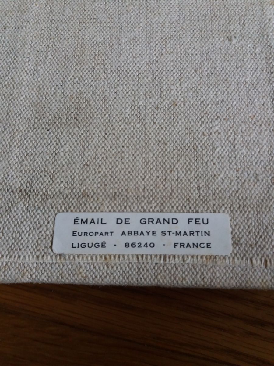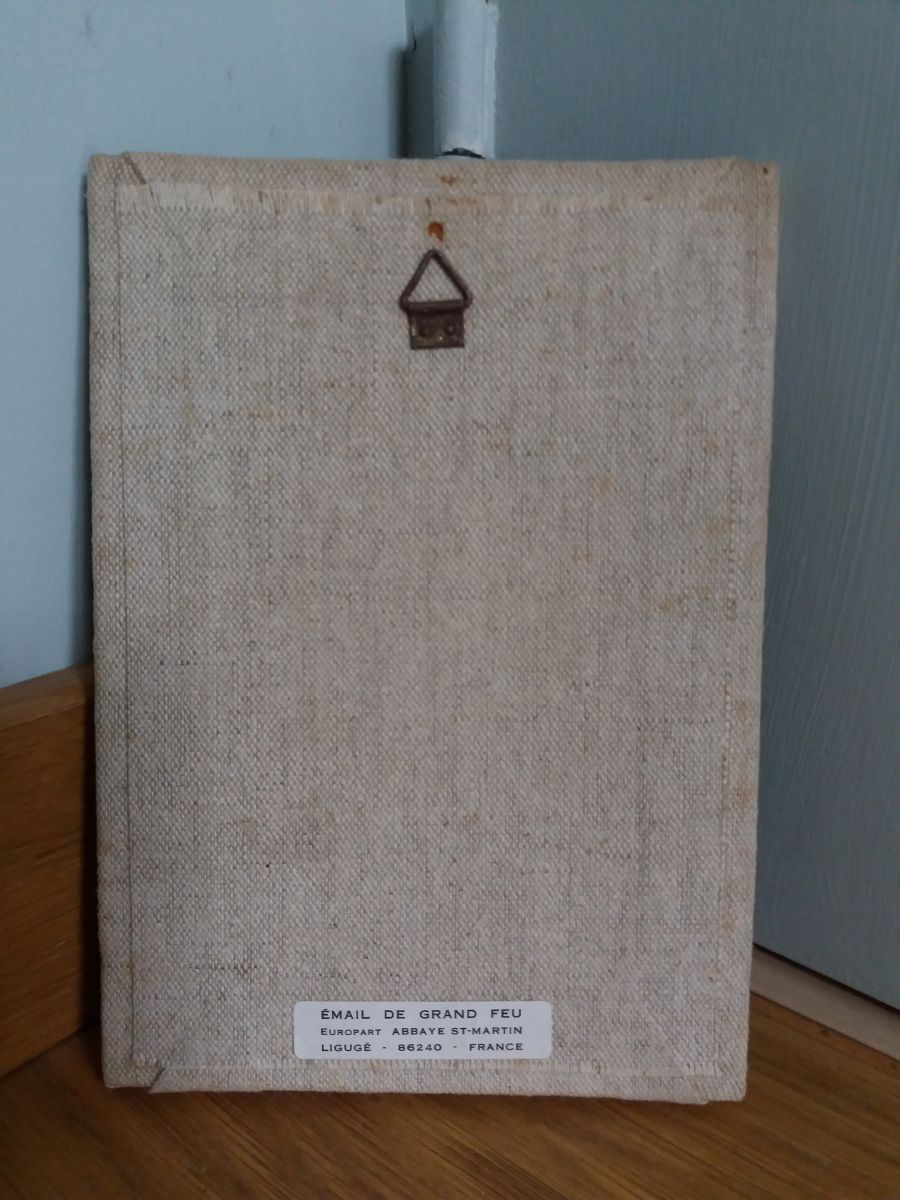 J'ai obtenu des précisions sur cet émail de la part des religieux travaillant dans l'atelier: cet émail a été réalisé en 200 exemplaires pour la papeterie Papault à Iteuil vers 1980, le dessin a été réalisé par le Père Jean Coquet (1909- 1989) qui fut en 1945 le fondateur de l’atelier d’émaillerie . L'émail est en parfait état, ni fêle, ni éclat. Le tissu présente quelques tâches ou colorations, celles en façade avant sont quasiment invisibles. L'émail mesure 16,5 par 11 cm, il est bombé et atteint environ 1,5 cm d'éloignement par rapport à la planchette en son centre. La planchette mesure 19 cm par 13,5 cm, pour une épaisseur de 1,2 cm. L'ensemble pèse 300 g.