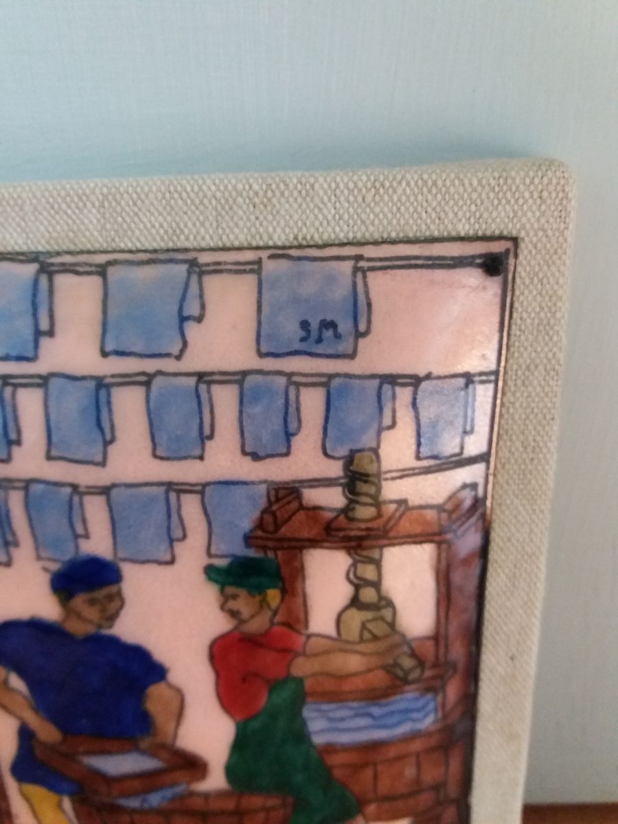 Très joli petit émail, joliment coloré, monté sur une planchette en bois recouverte de lin, et munie d'une petite attache triangulaire à l'arrière. Il a été fabriqué par les moines de l'Abbaye Saint-Martin à Ligugé. Il représente deux artisans en train de fabriquer du papier. Il est signé SM (pour Saint-Martin). A l'arrière une étiquette indique « Email de grand feu – Europart – Abbaye Saint-Martin – Ligugé – 86240 - France ». Cette Abbaye est connue aujourd'hui encore et depuis l'après-guerre pour ses créations d'émaux, certains des moines sont même mondialement reconnus et ont exposé dans de nombreuses villes à travers le monde.