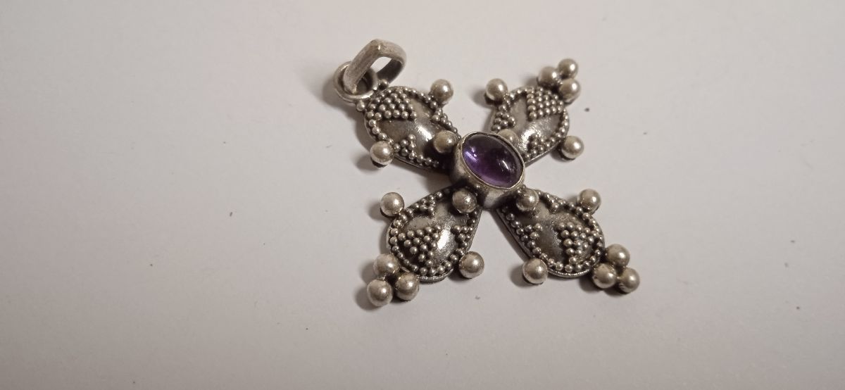 3) Quatre formes ovales rayonnant de la pierre centrale. Chaque ovale a une série de très petits points en relief formant un motif triangulaire. Trois de ces ovales sont surmontés de 3 boules avec une autre boule de chaque côté et à la base. Le quatrième ovale est le même sauf qu'il a le lien de suspension en haut au lieu des balles. La pierre est de couleur violacée. Mesure environ 1,7/16"/ 3,6 cm x 1,6/16"/ 3,4 cm y compris le lien de suspension fixe mais pas le lien lâche