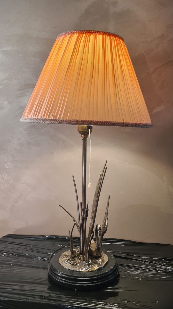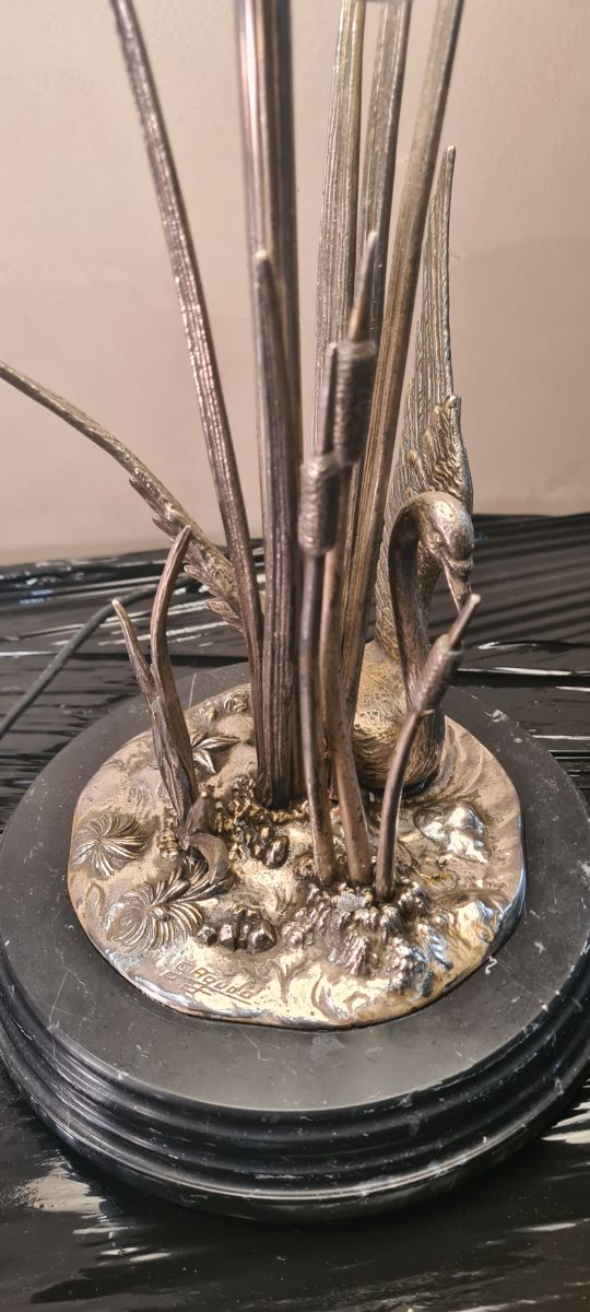 Lampe de Bureau en Marbre et Métal Plaqué Argent cigne Décoré signé par Agudo,