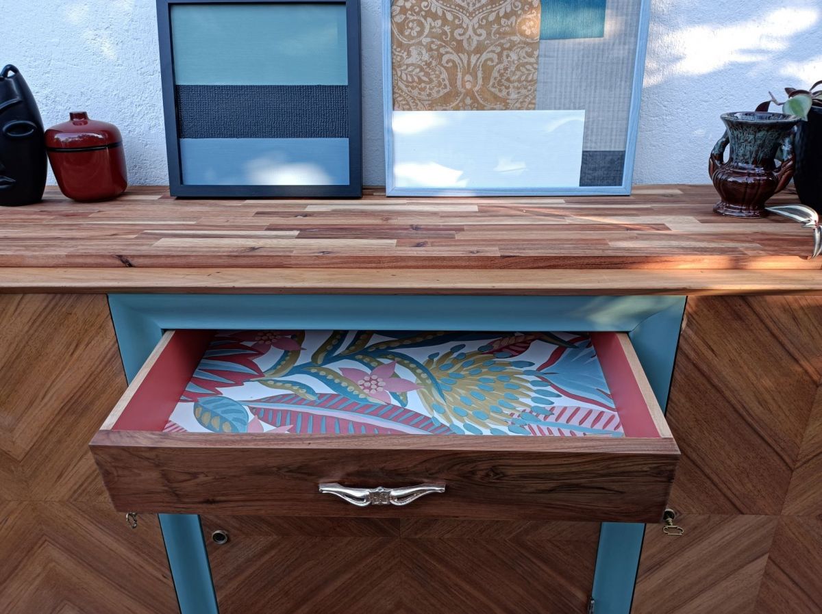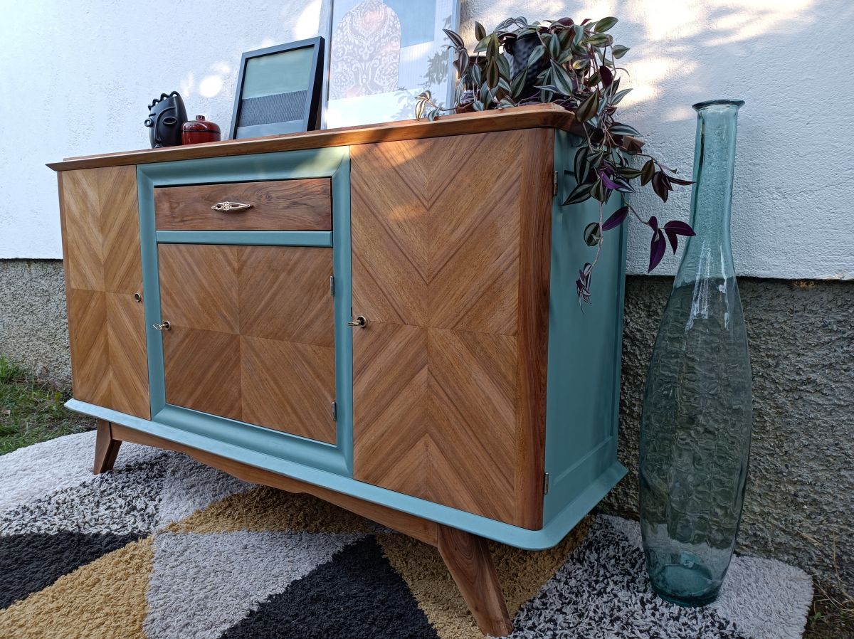Meuble, aux belles portes marquetées et à l’allure à la fois vintage et scandinave. Le meuble a été débarrassé de son vernis foncé pour retrouver tout son naturel et a été protégé par de la cire liquide qui rend le bois tout doux au toucher. Le buffet a été relooké dans une teinte bleu vert « saulaie », de la marque colibri qui produit de la peinture écologique biosourcée. La touche de couleur amène de la fraicheur à l’ensemble et fait ressortir la couleur du bois. L’intérieur a été repeint dans le même ton et l’étagère en gris pour donner du rythme. Le tiroir est tapissé d’un papier floral et ourlé de bois de rose. Le marbre d’origine étant cassé, un plateau en acacias a été posé et donne plus de modernité et de légèreté. Le meuble dispose de 2 clefs.