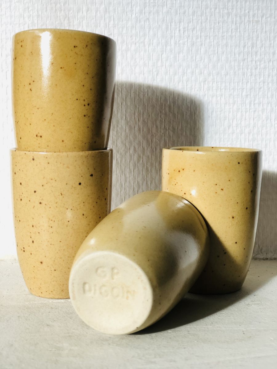 Lot de 4 gobelets en grès beige et moucheté. Manufacture Digoin. Ensemble en parfait état.