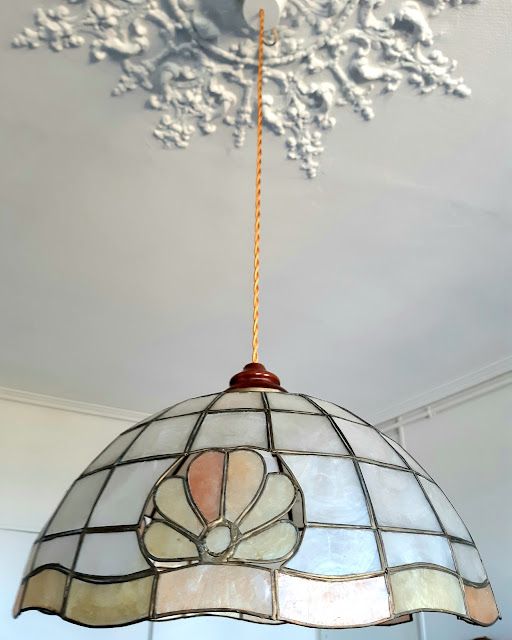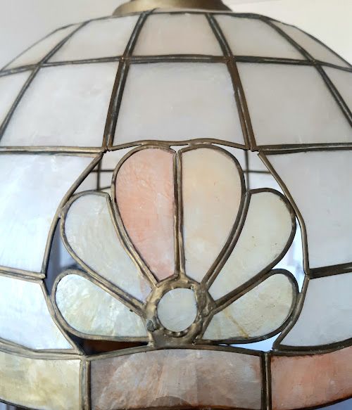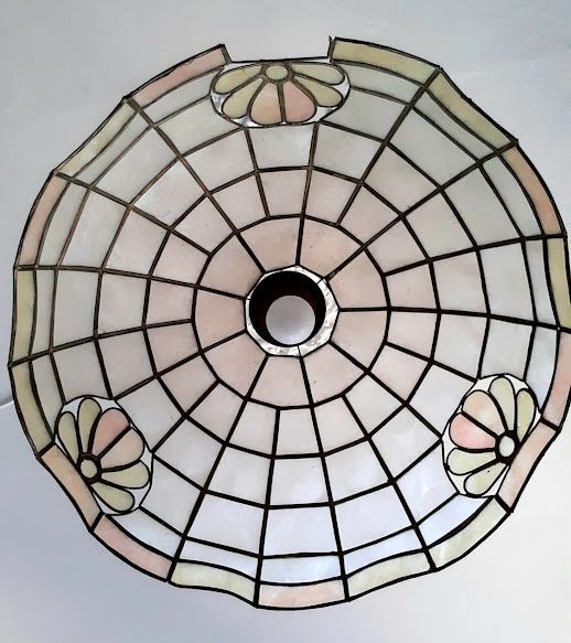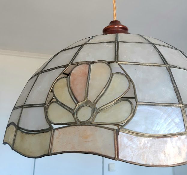 Suspension de forme demi sphérique composée de plaques de nacres en alternances de couleurs : beige, jaune et rose. Décor de 3 fleurs en bordures.