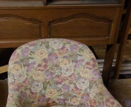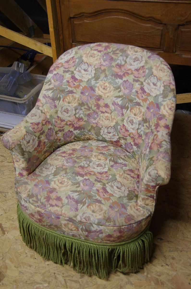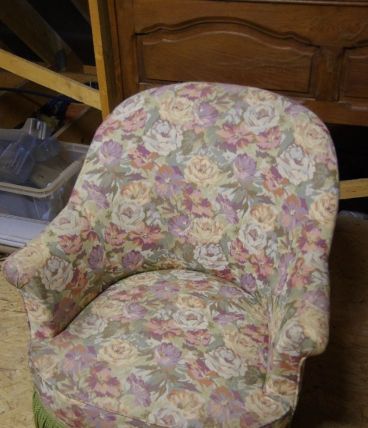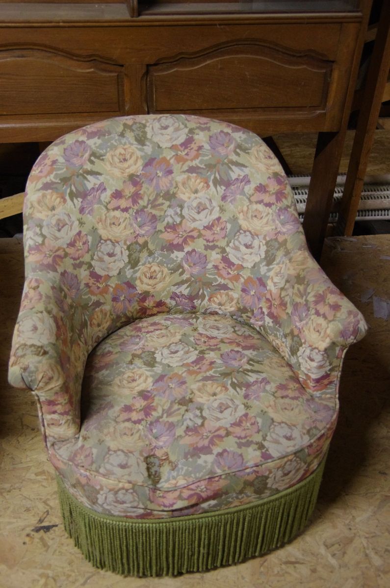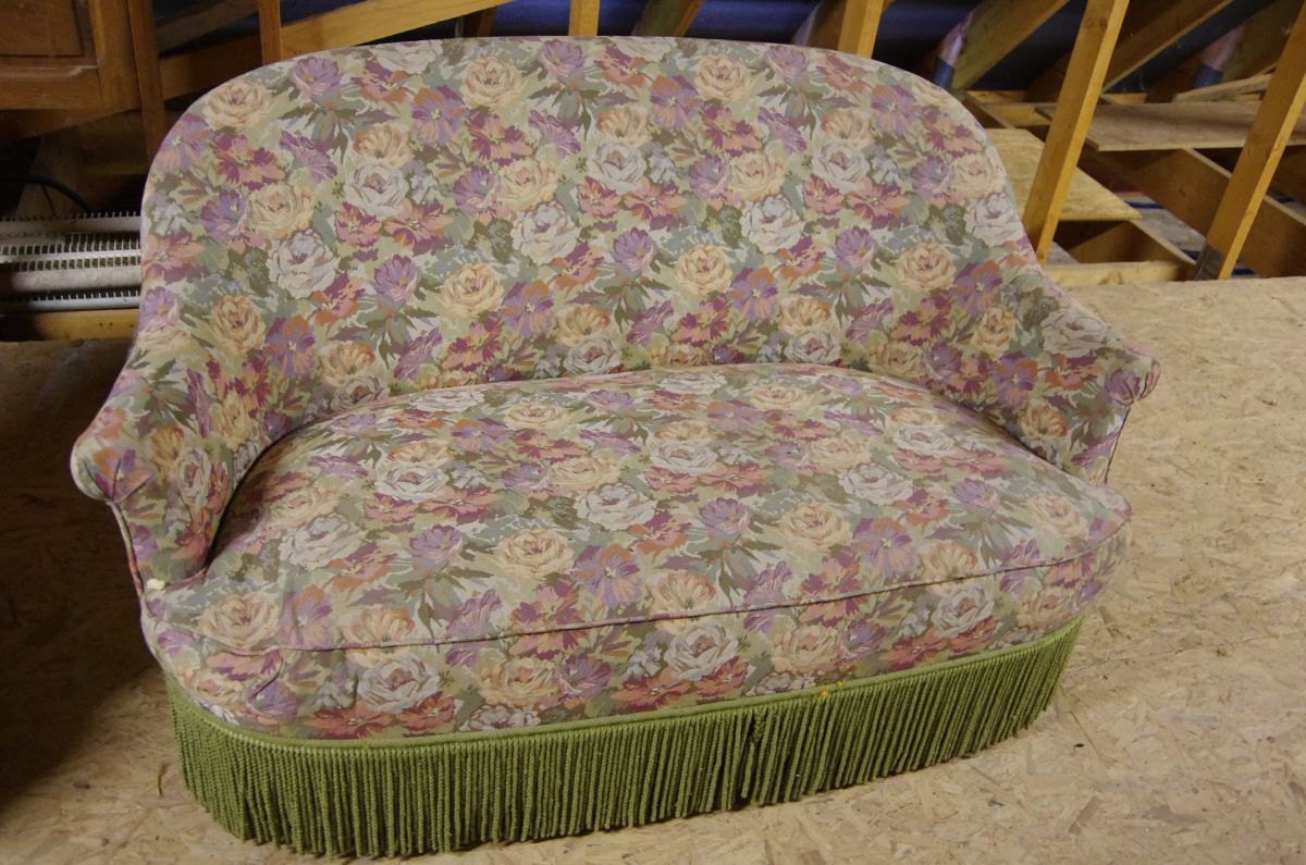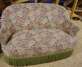 Vend un canapé deux places et trois fauteuils crapaud à franges. En tissu fleuri style art déco. L'ensemble en bon état.