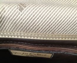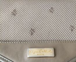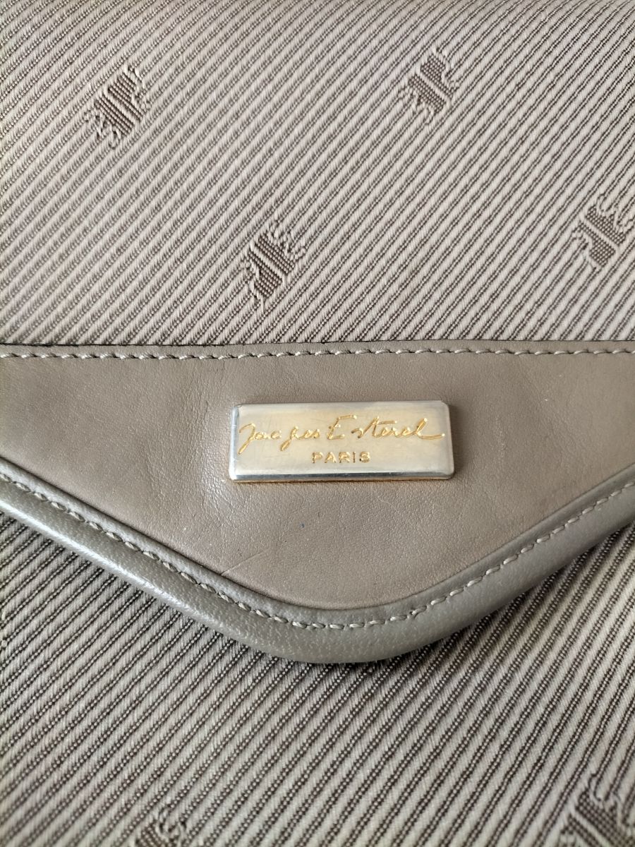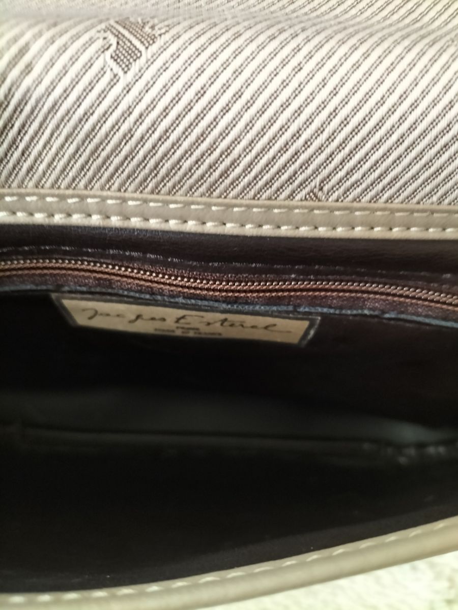 Sac chic de couleur taupe à bandoulière en toile des années 80 avec 1 poche externe et 2 poches internes ; dimension 25x20x6 cm ; très bon état