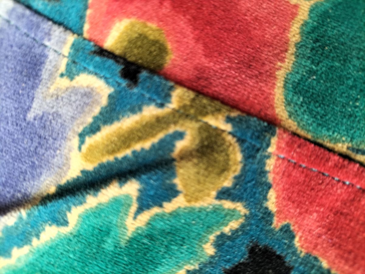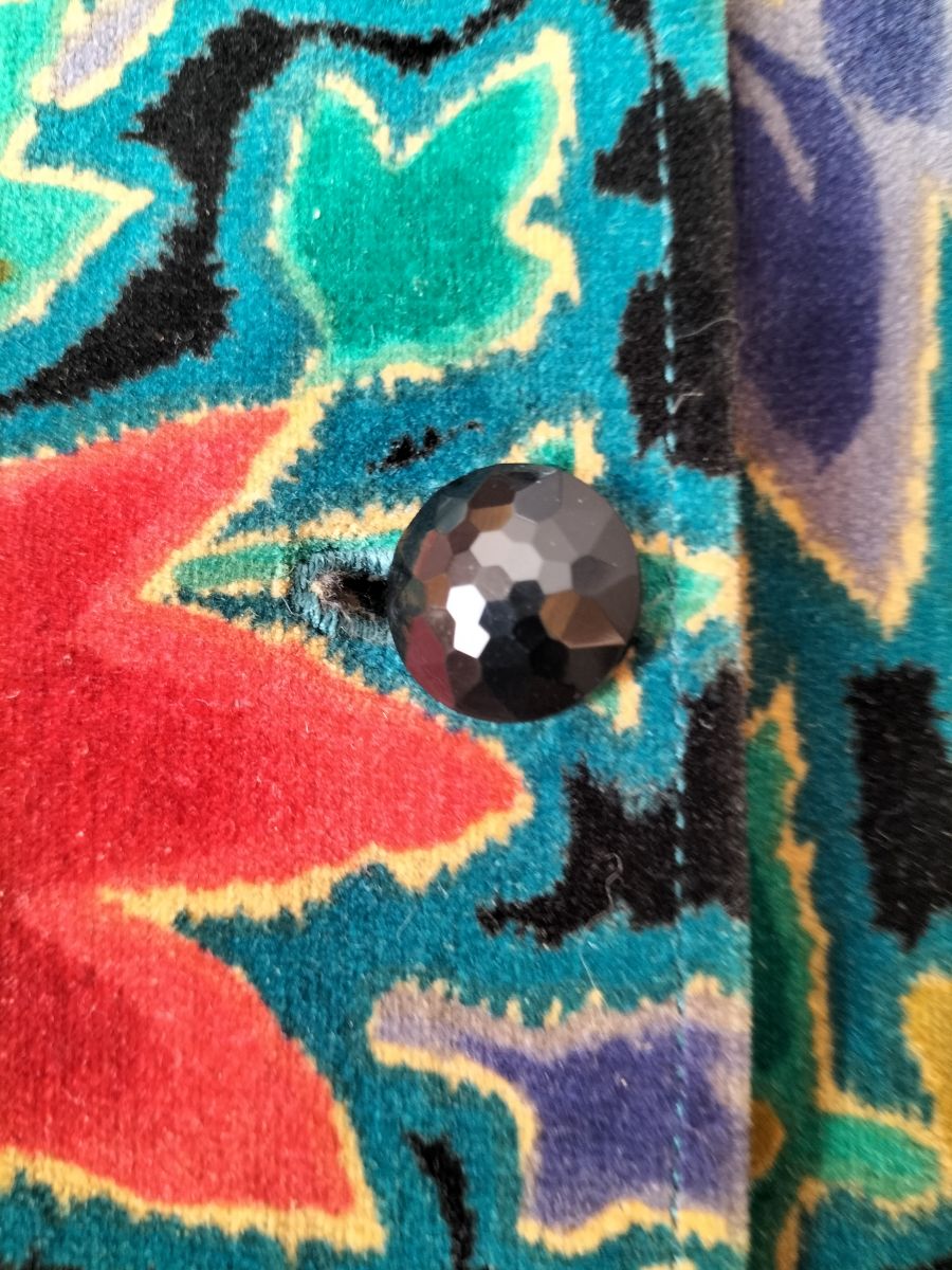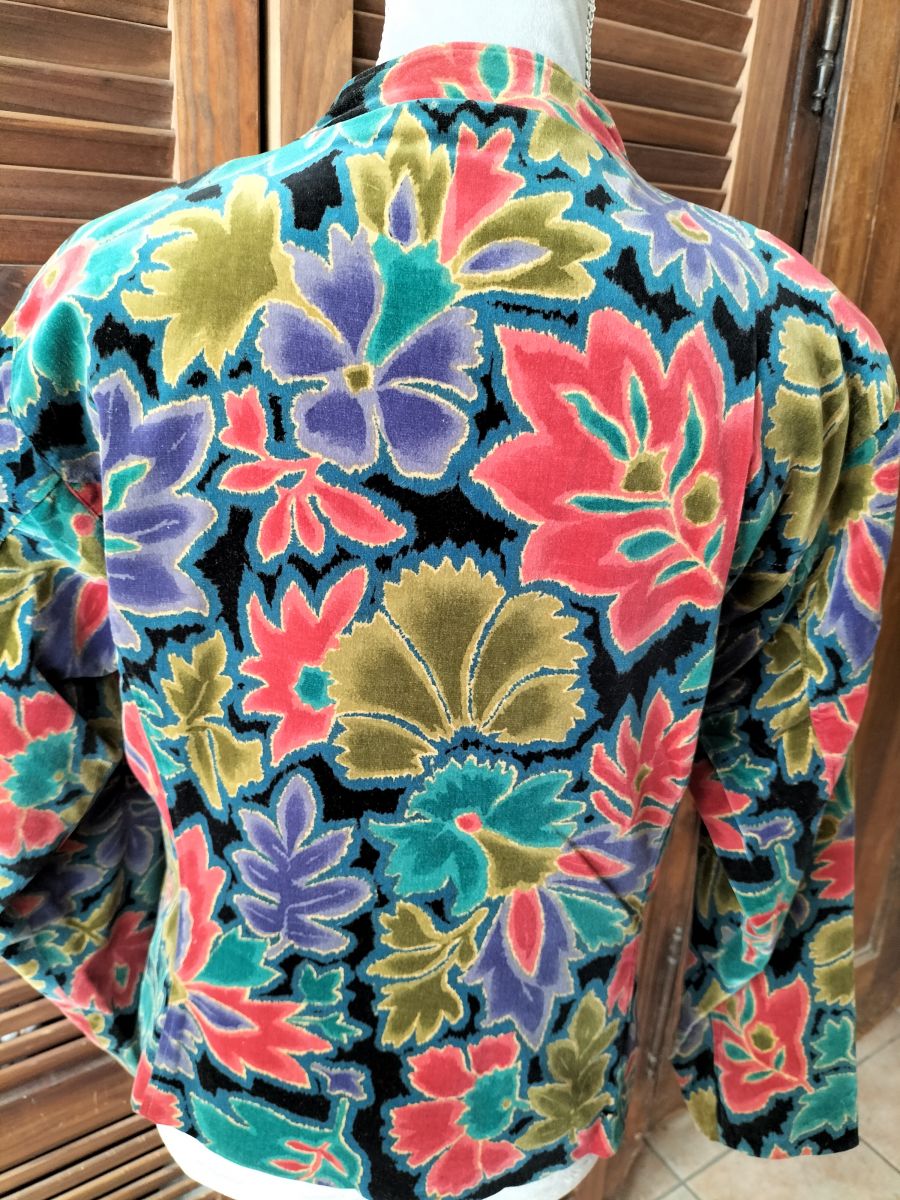 Veste chic courte ceintrée en velours ras imprimé feuillage d'automne confectionnée dans les années 80 ; bouton à facettes ; 2poches passepoilées devant ; découpe princesse dos ; entièrement doublée ; très bon état