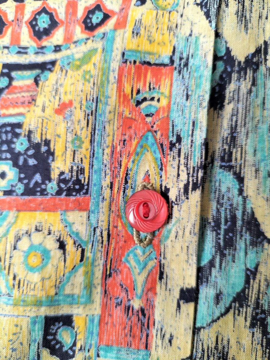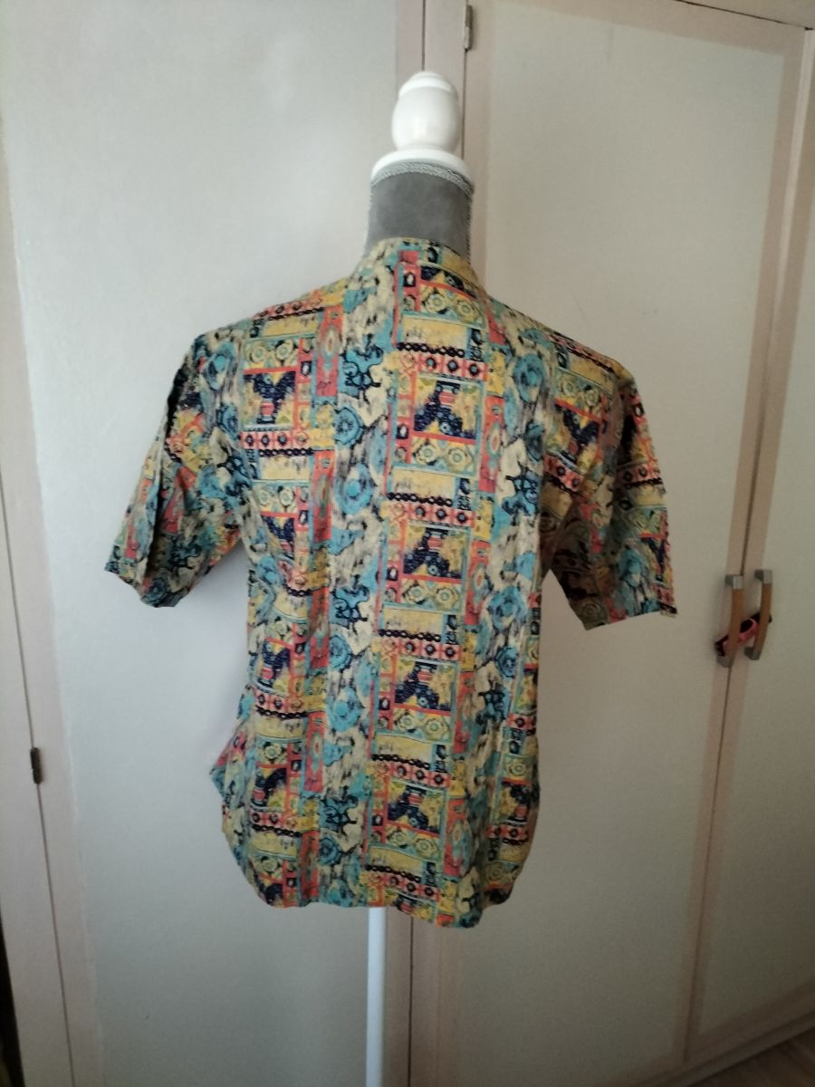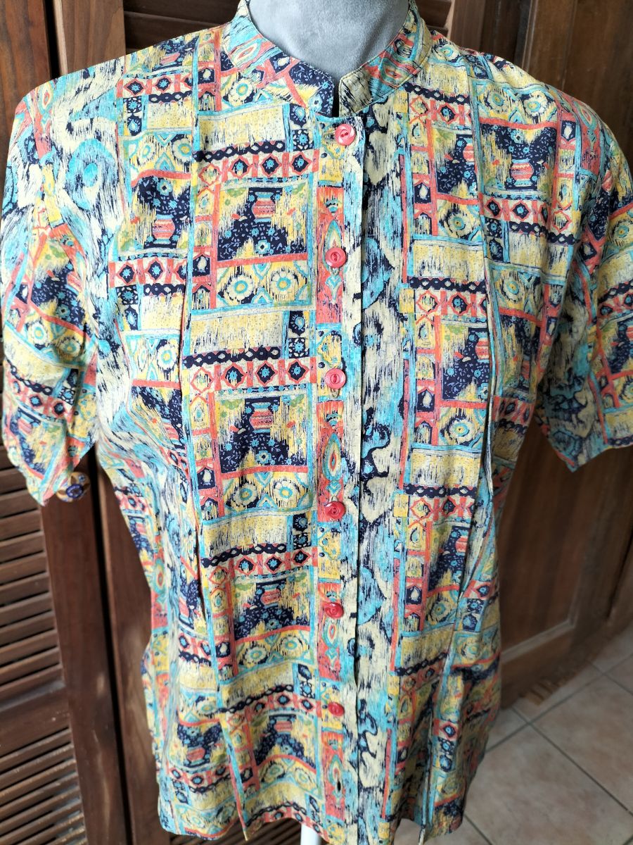 Chemisier col Mao en soie à manche courte avec pli creux poitrine et petite fente bas devant ; dans un imprimé ethnic confectionné dans les années 80 ; très bon état