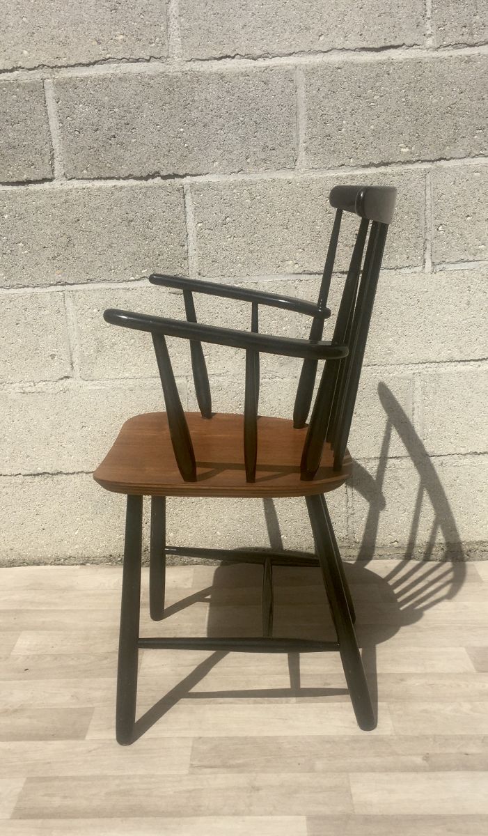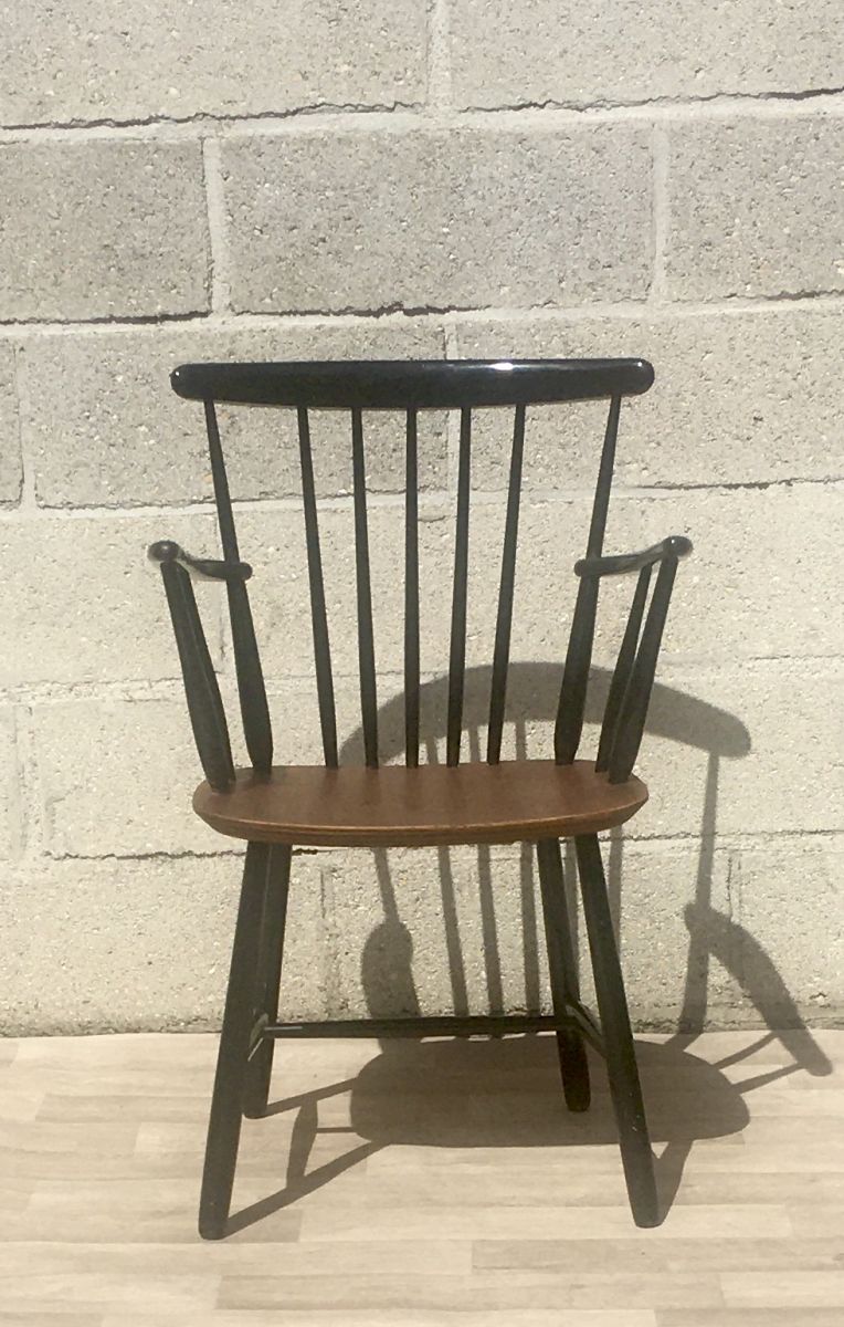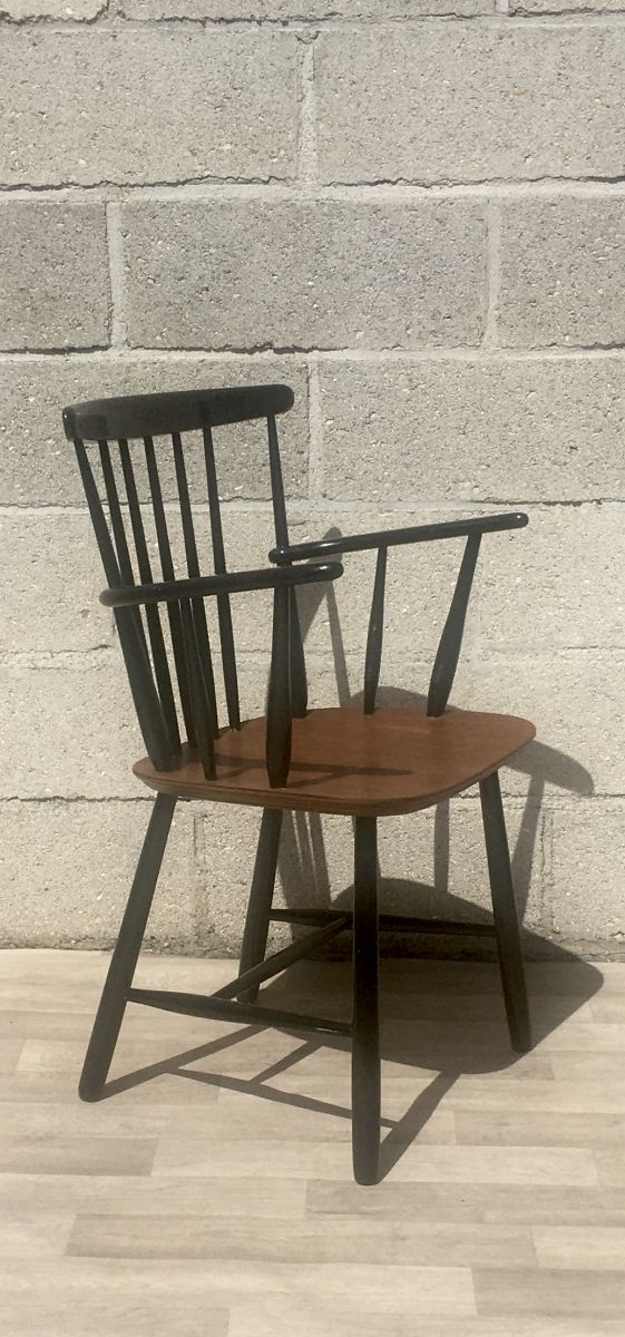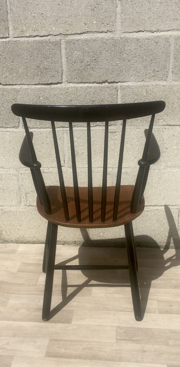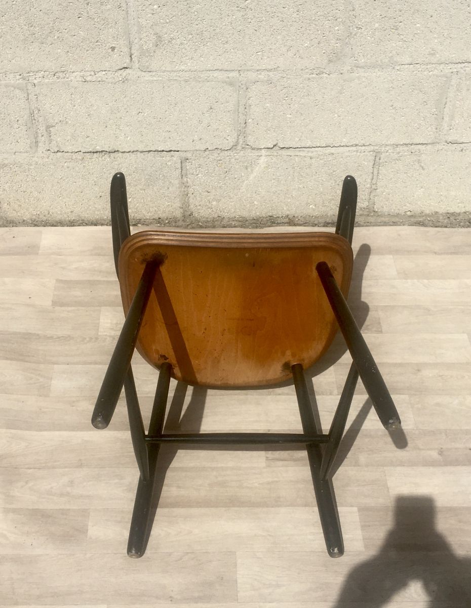 ♻️Fauteuil vintage design scandinave en bois laqué noir et assise couleur miel. Structure en bel état solide et stable, belle patine avec quelques traces d'usage .