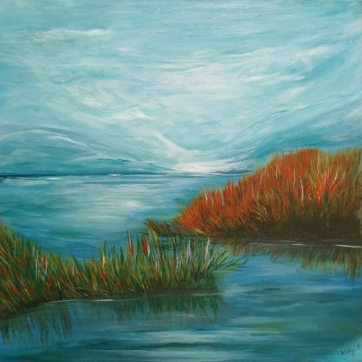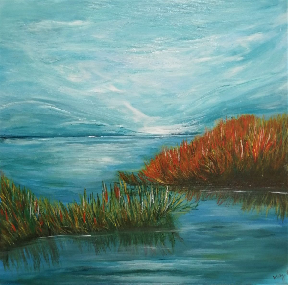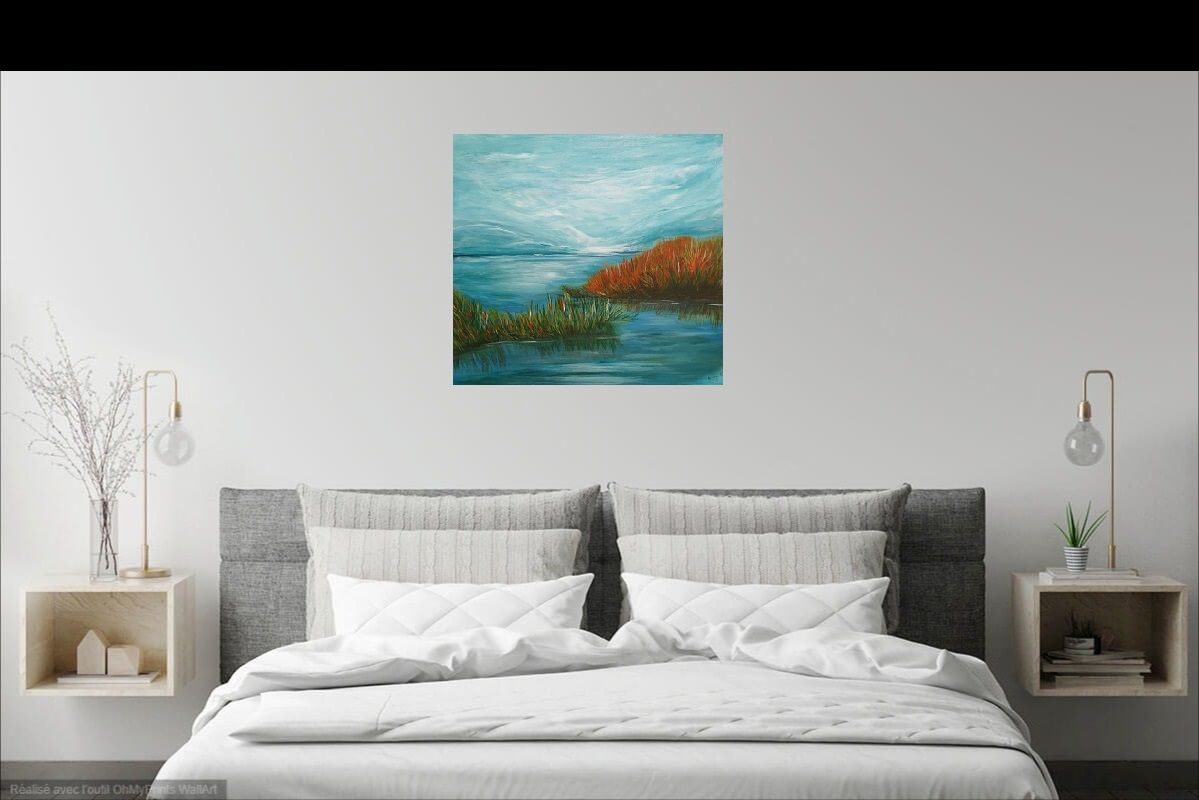 Le tableau se nomme "Le retour", plusieurs nuances de bleu utilisées pour donner à la toile plus de lumière et de présence;