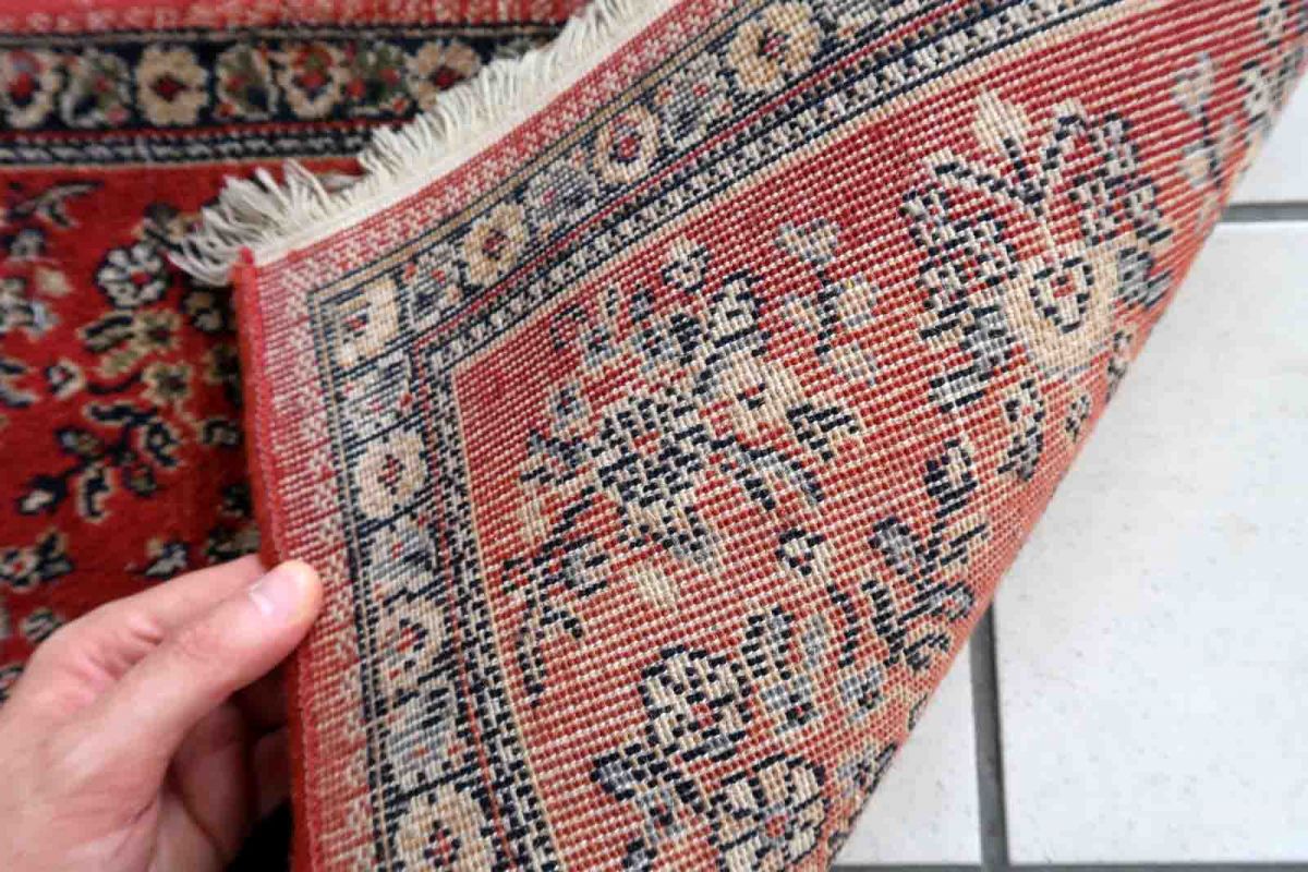 Vintage red German rug in traditional Persian Sarouk design. The rug has been made in the end of 20th century, it is in original good condition. The rug is machine made.