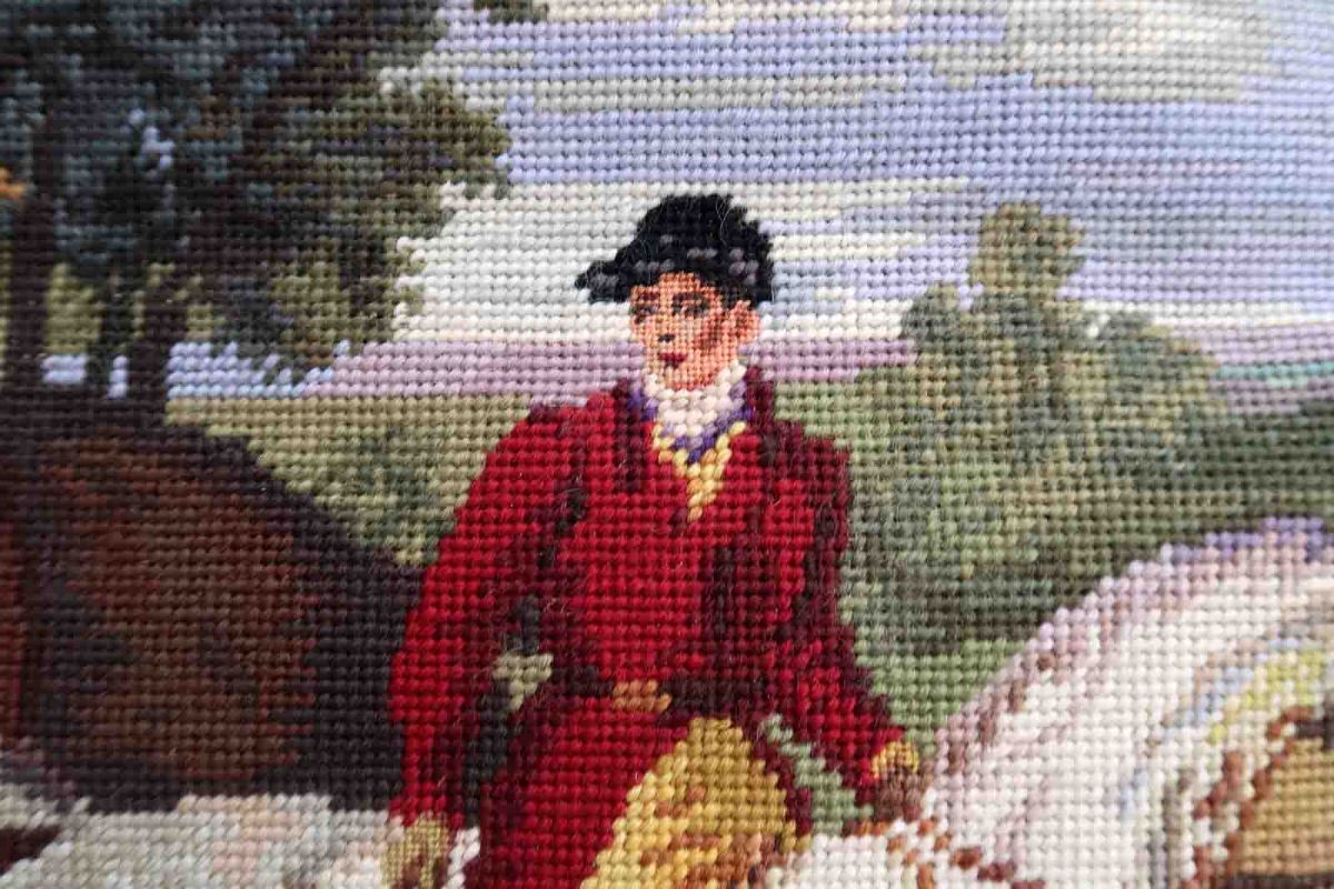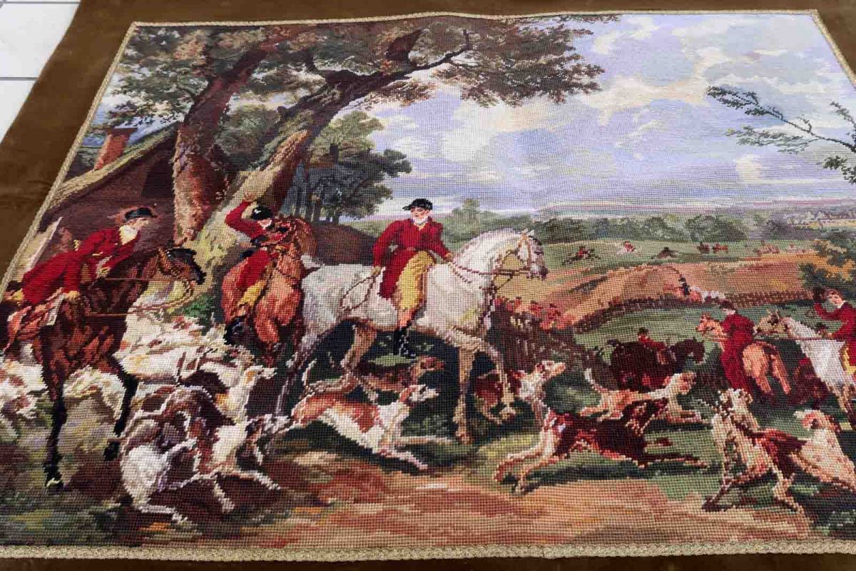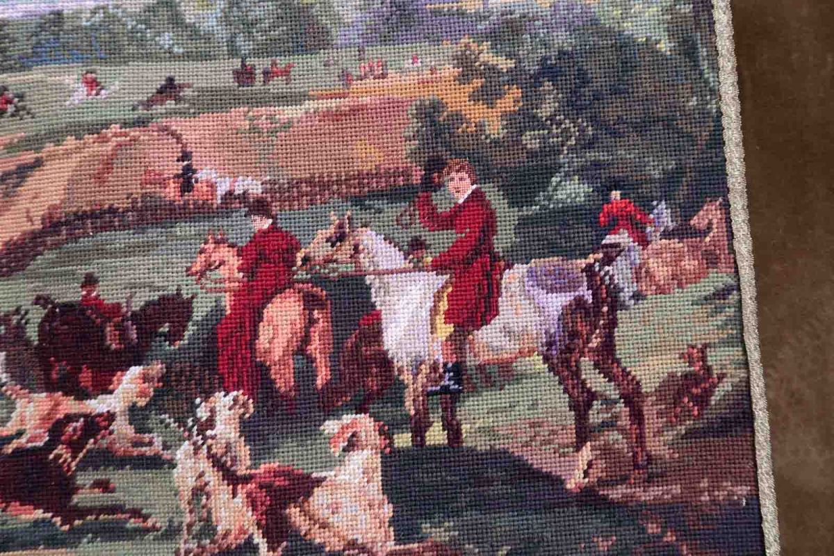 Vintage tapestry from France with hunting scene. The tapestry is from the middle of 20th century in original good condition. The rug made in cotton and the frame is from velour.