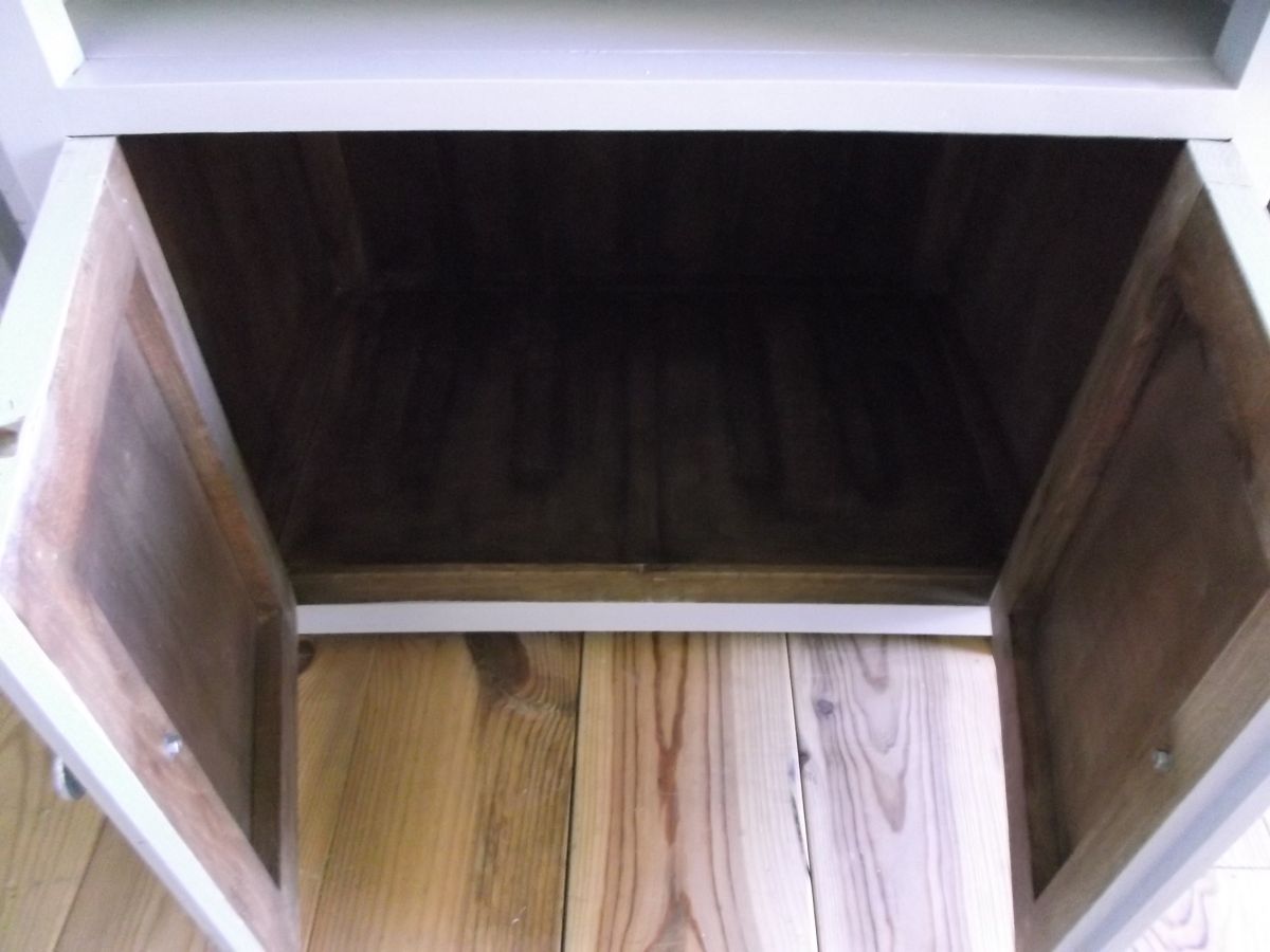Petit meuble d 'appoint, de couleur gris clair, en chêne massif, vintage, boutons métal d 'origine, plateau chêne massif, brut verni. Il est parfait pour de petits rangements.