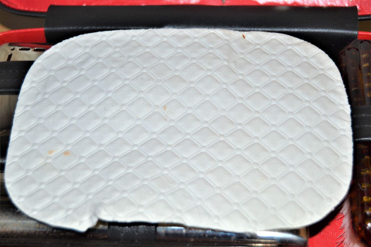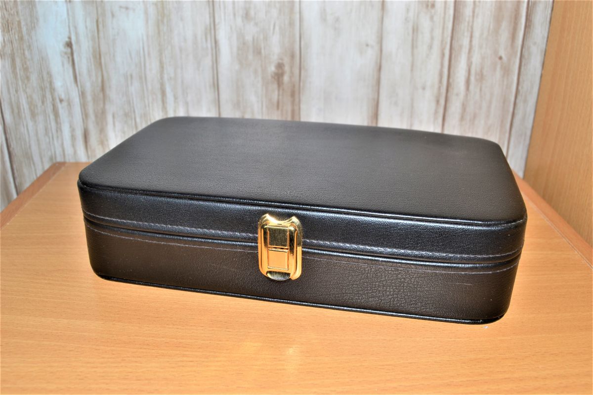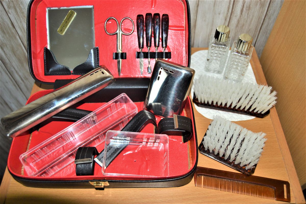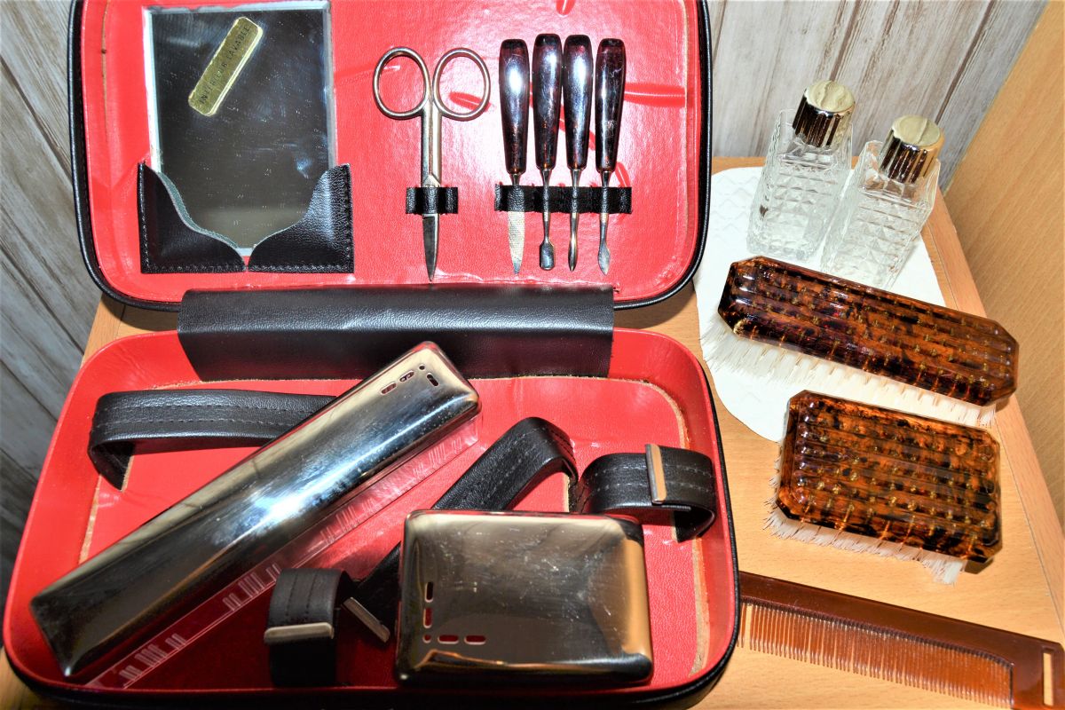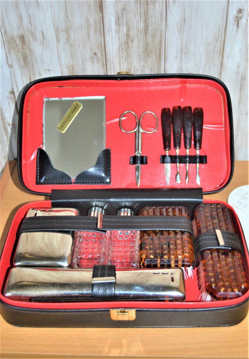 trousse de toilette années 50's ,en cuir noir, intérieur rouge lavable, complète, manque une dent au peigne et la mini serviette papier de protection d'origine n'est pas en parfait état