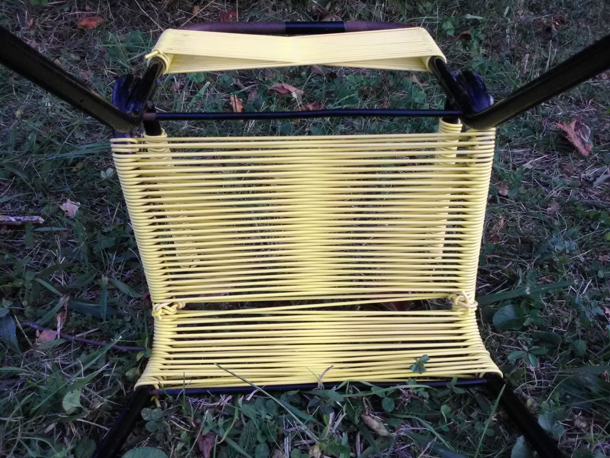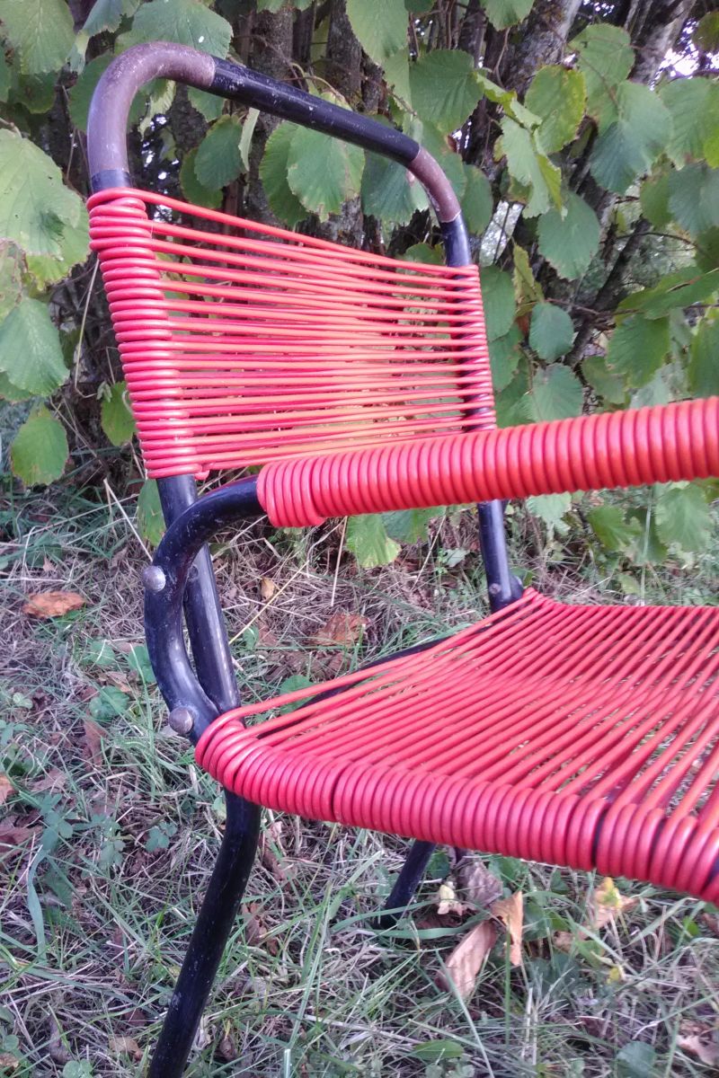 Les chaises sont vendues dans leur jus (à noter des marques d'usage : manque de peinture sur les structures en métal et réparation de l'assisse en scoubidou sur la chaise jaune - voir photos)