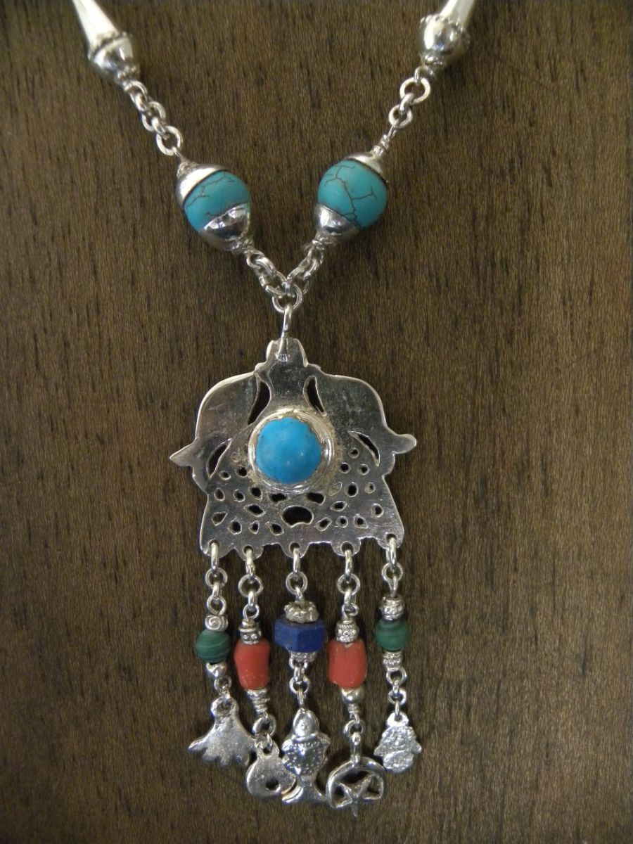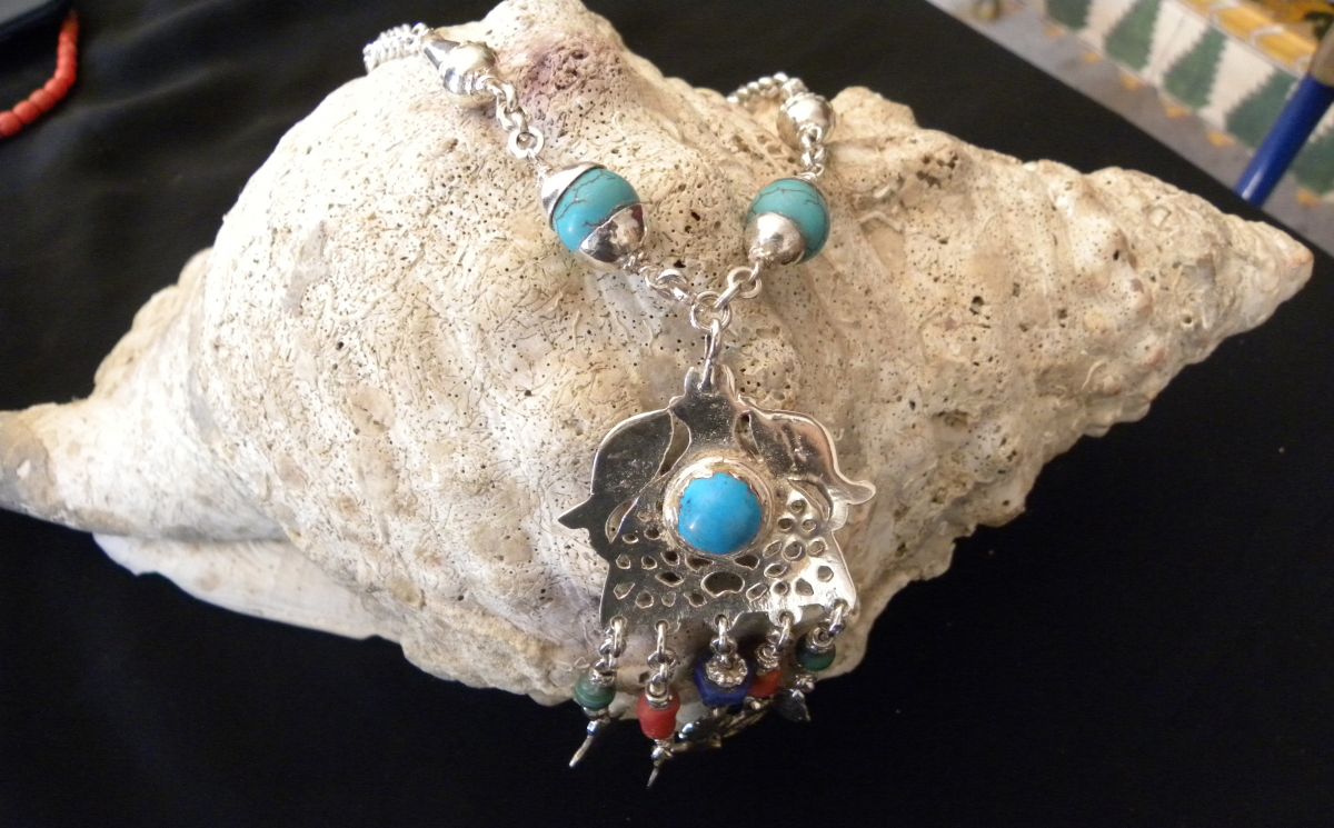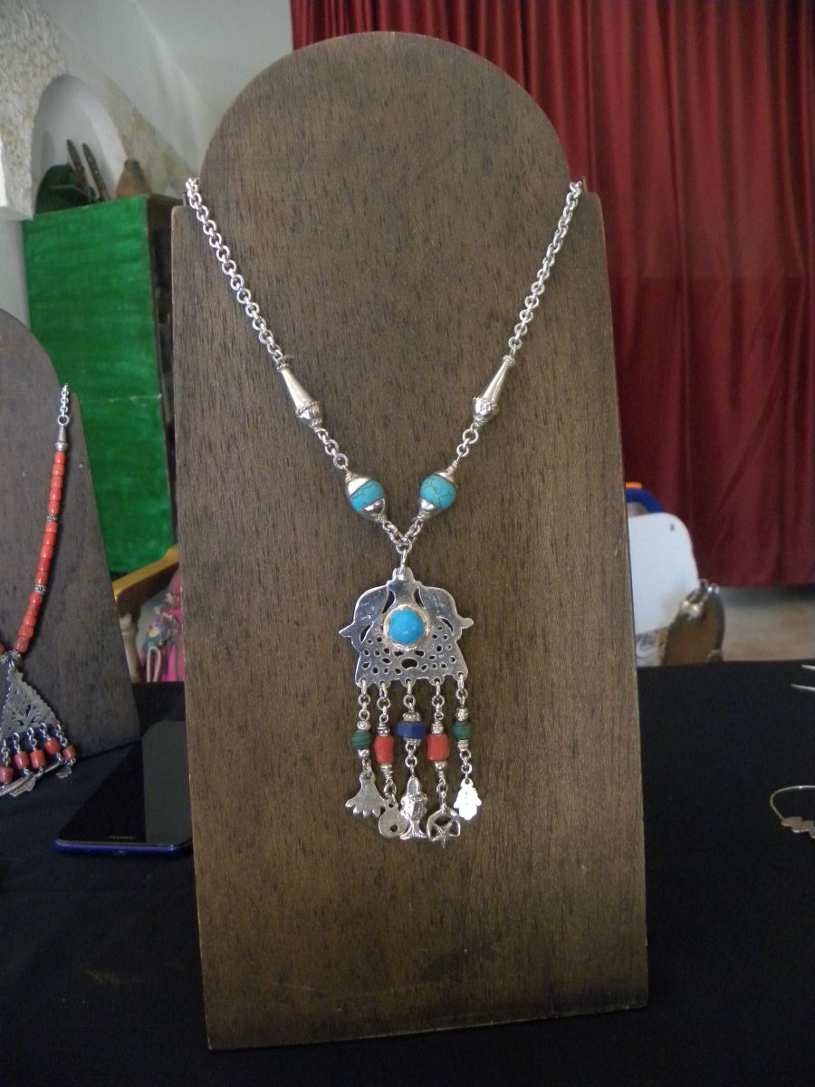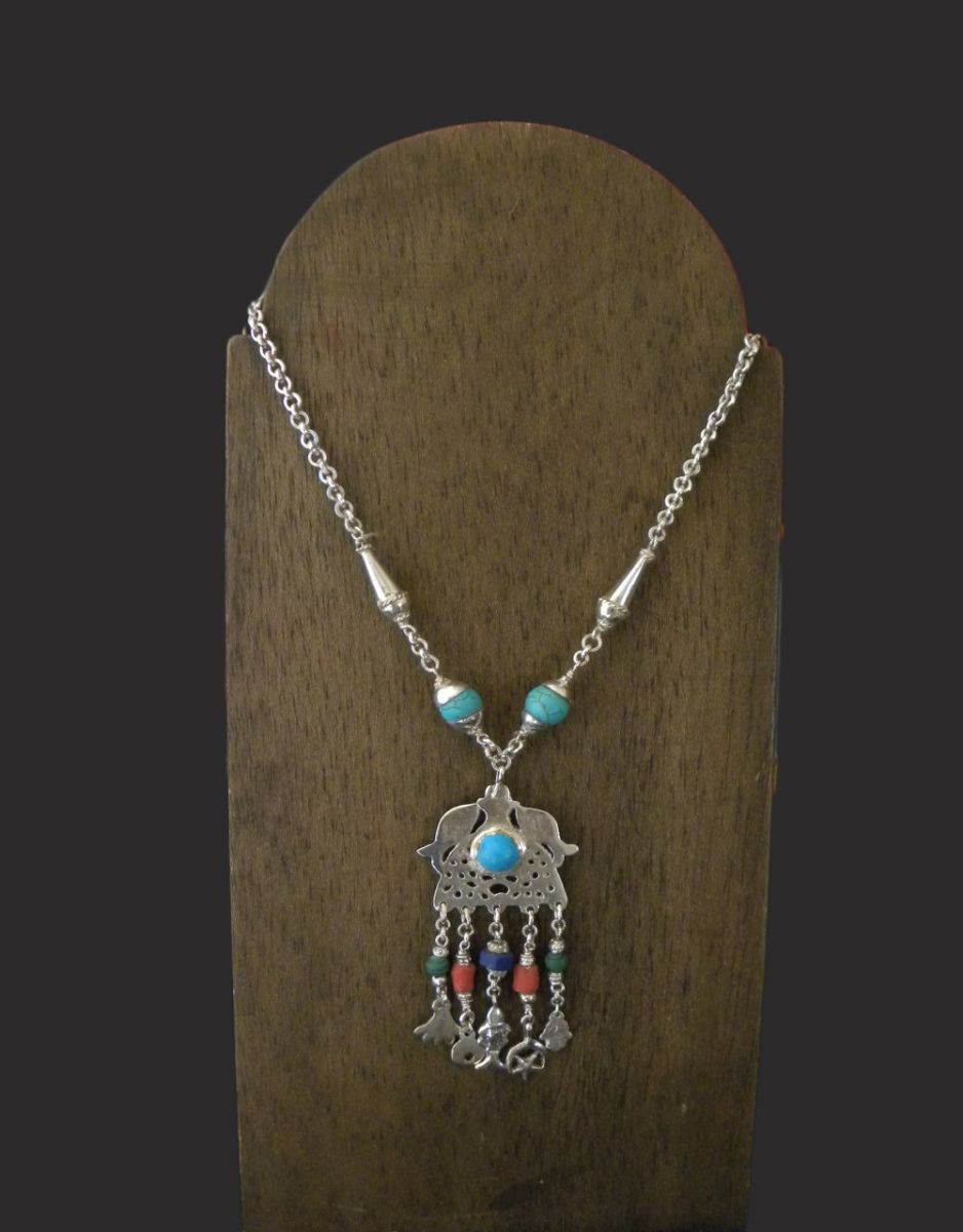 Collier berbère tunisien fibule avec fétiche en argent corail et turquoise.