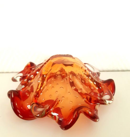 Elégant vide poche en verre de Murano de couleur orange, utilisant la technique de bulles contrôlées dans le verre, dite de Bullicante.