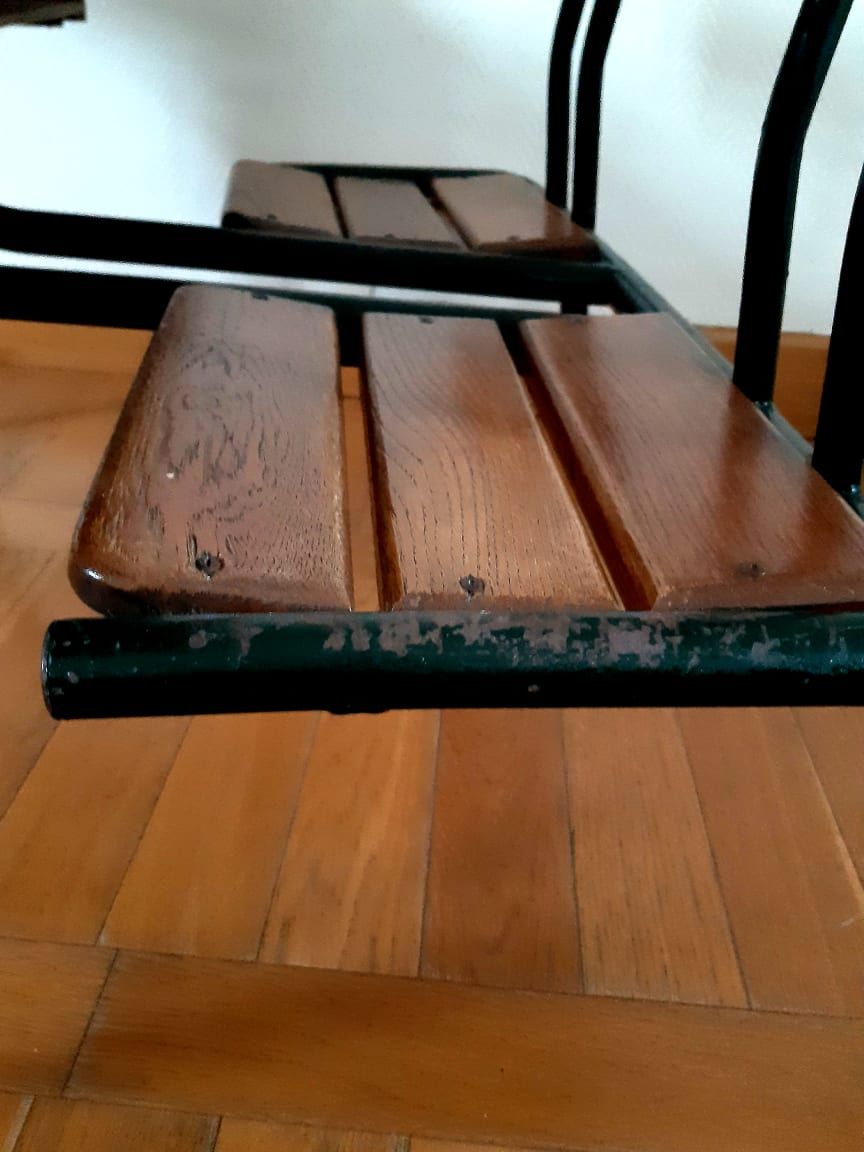 Bureau d'écolier à deux places en hêtre et structure tubulaire peinte en vert bouteille.