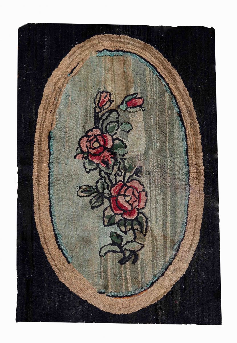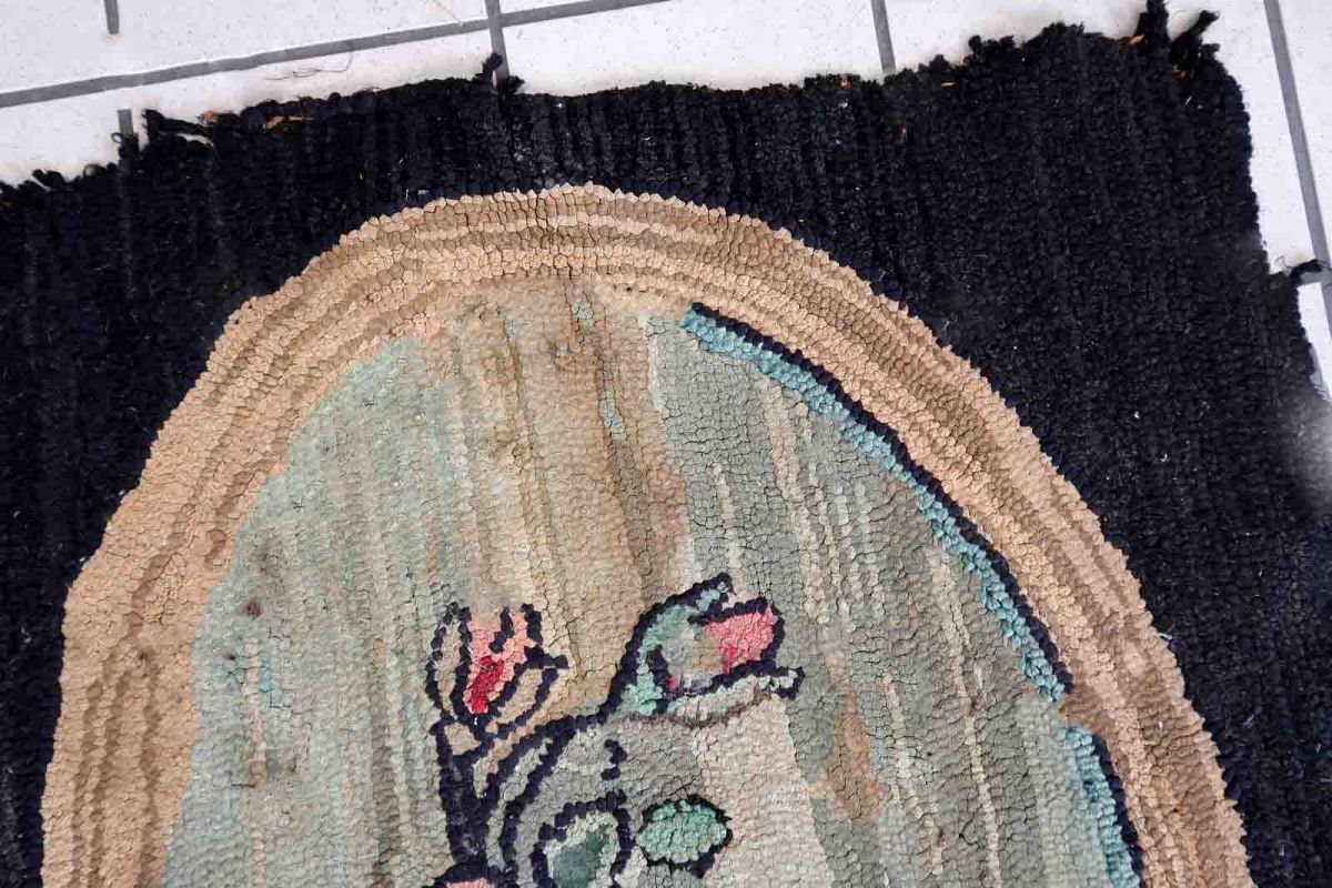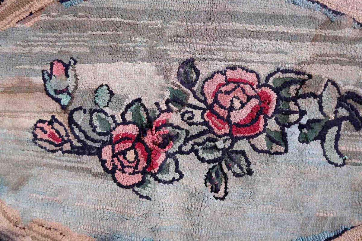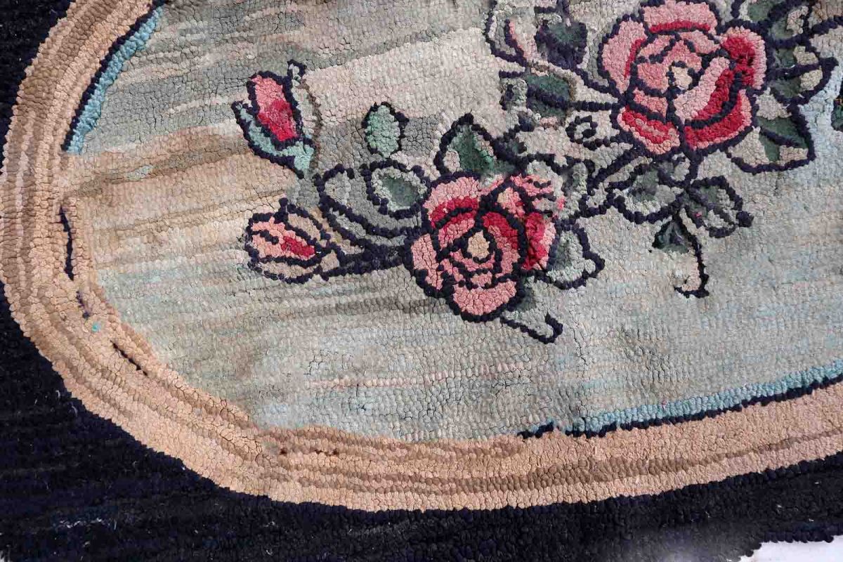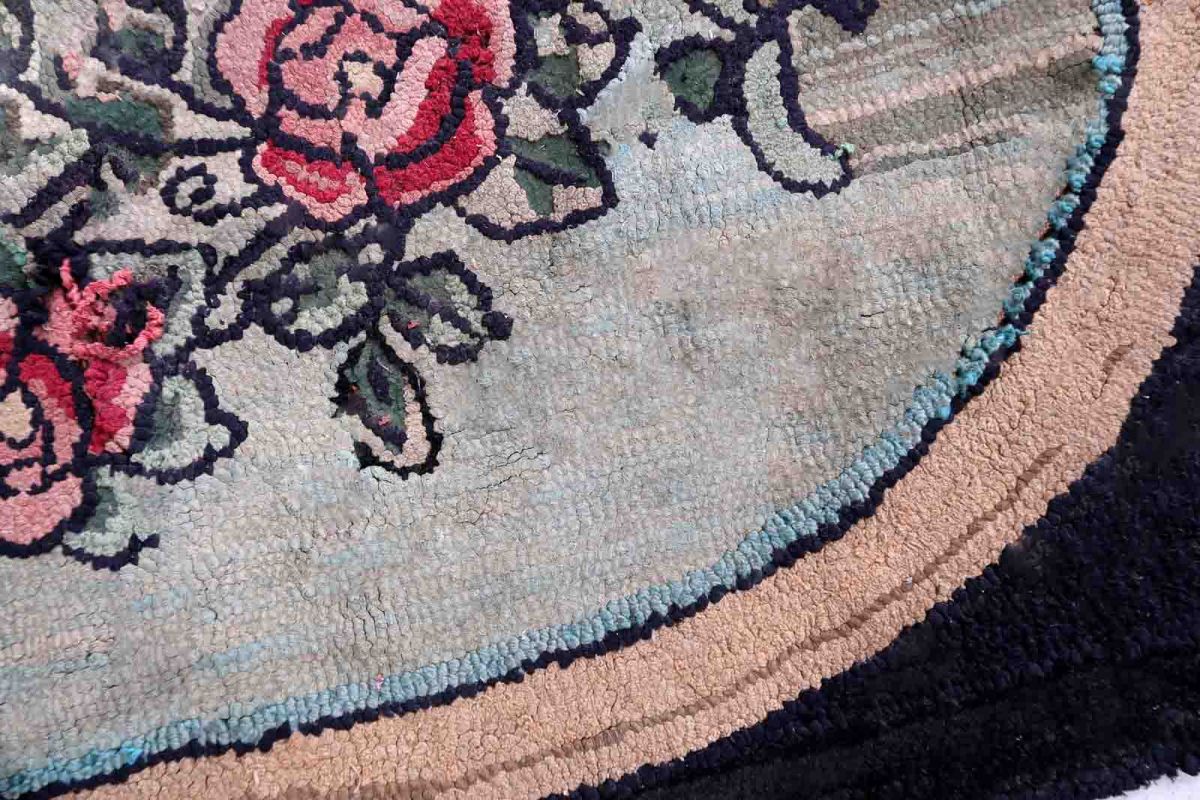 Handmade antique American Hooked rug in floral design. The rug is from the beginning of 20th century. It has some old restorations and discolorations.