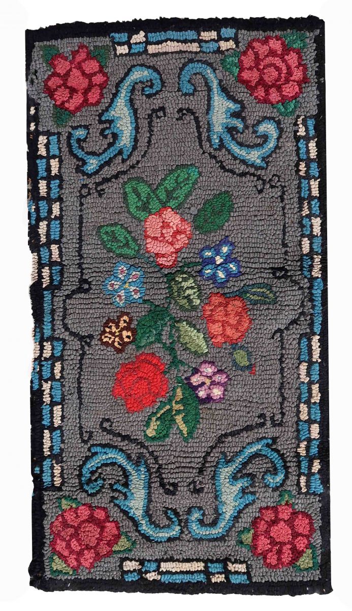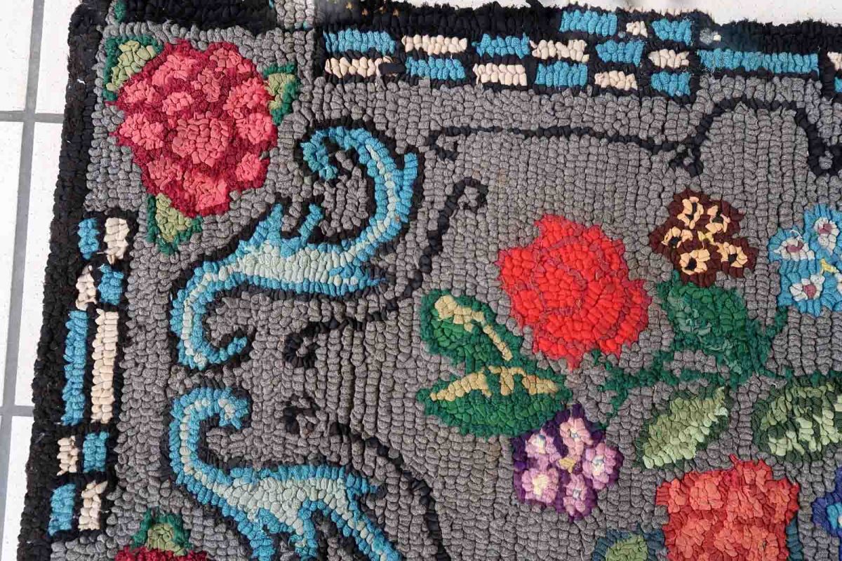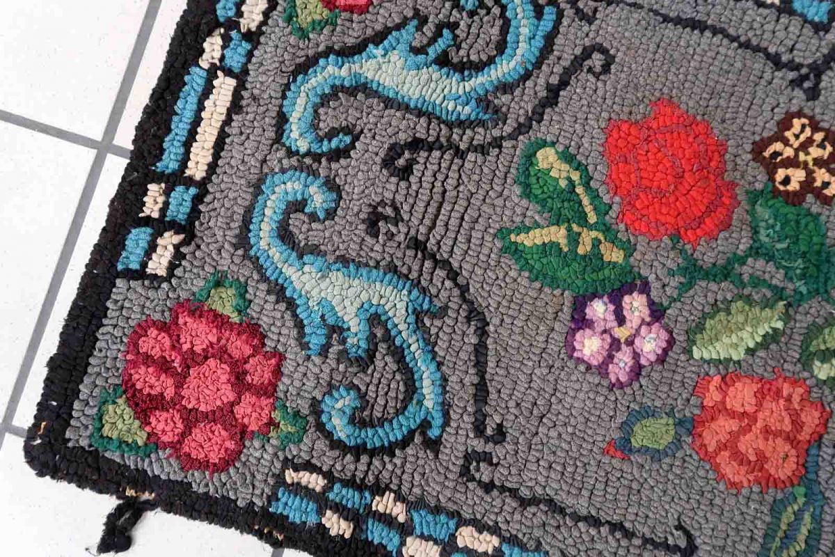 Handmade antique American Hooked rug in floral design. The rug is from the beginning of 20th century. It is in good condition, has some old restorations.