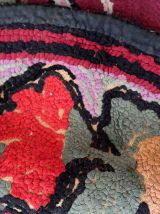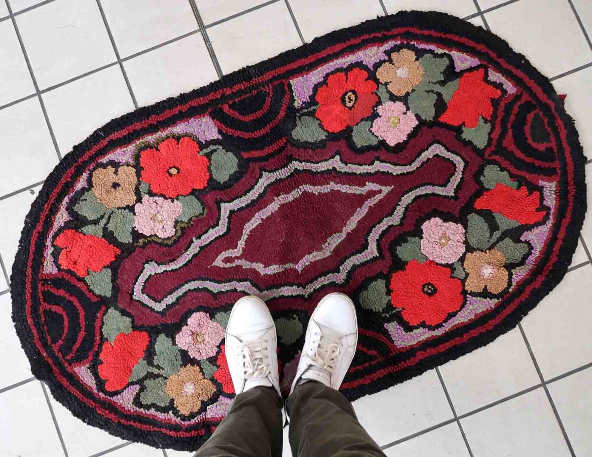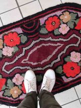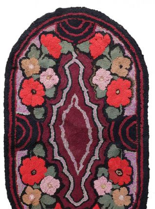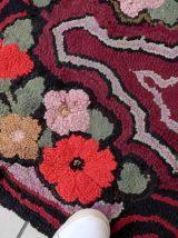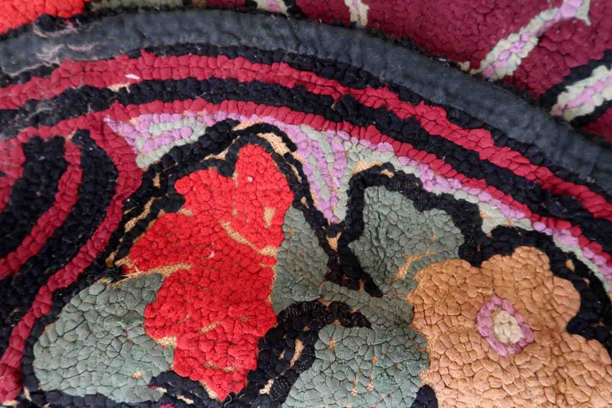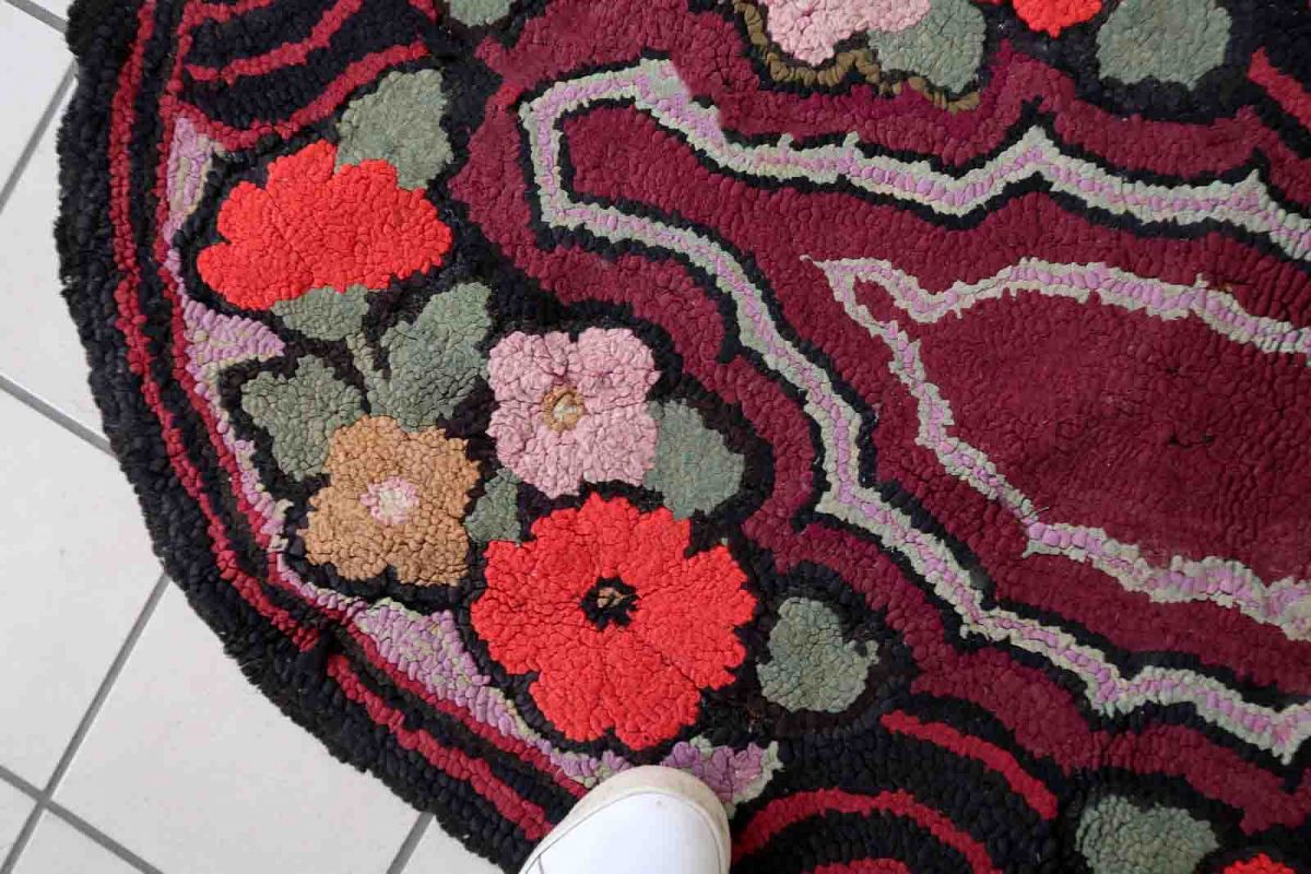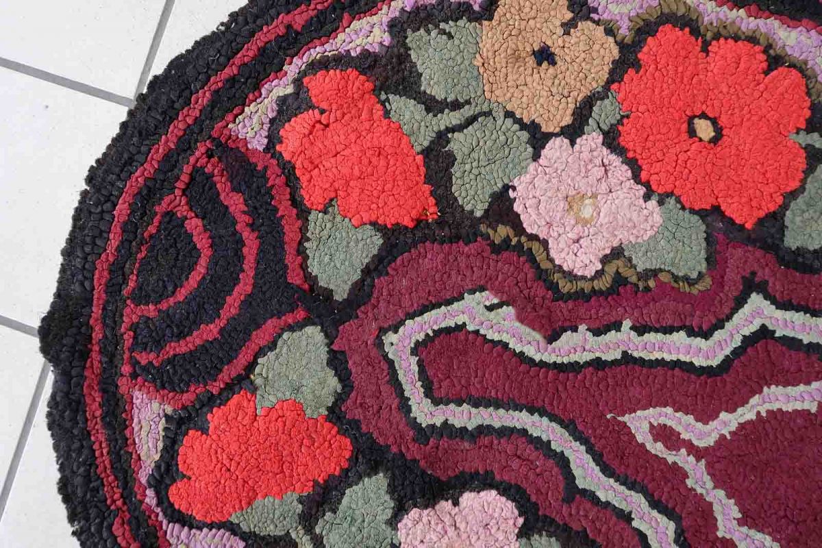 Handmade antique American Hooked rug in floral design and black background. The rug is from the beginning of 20th century. It is in good condition, has some old restorations.