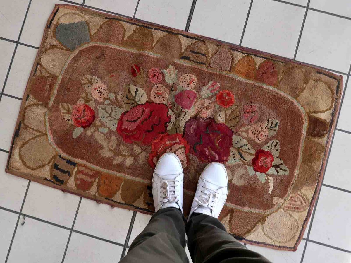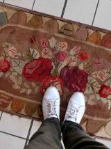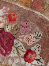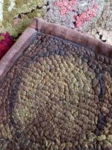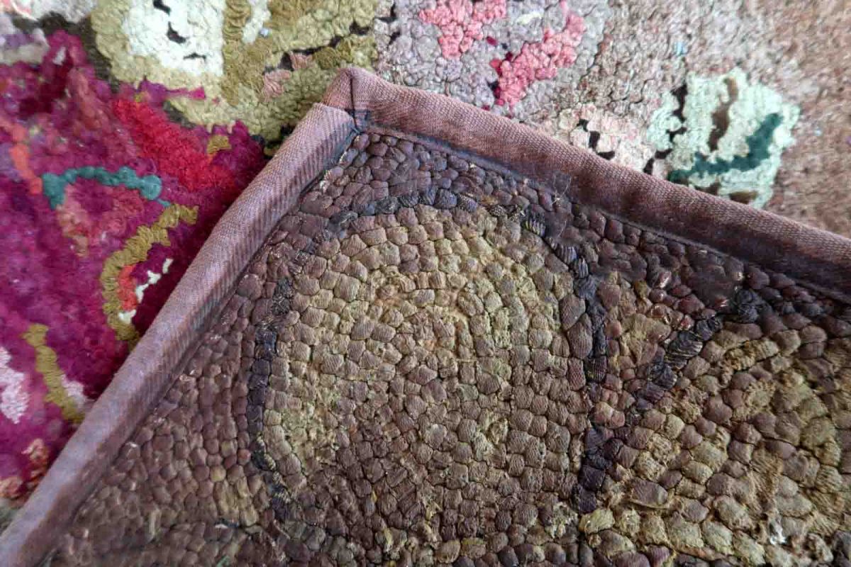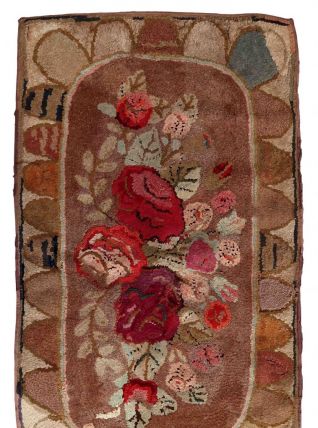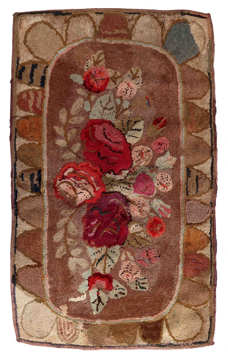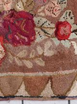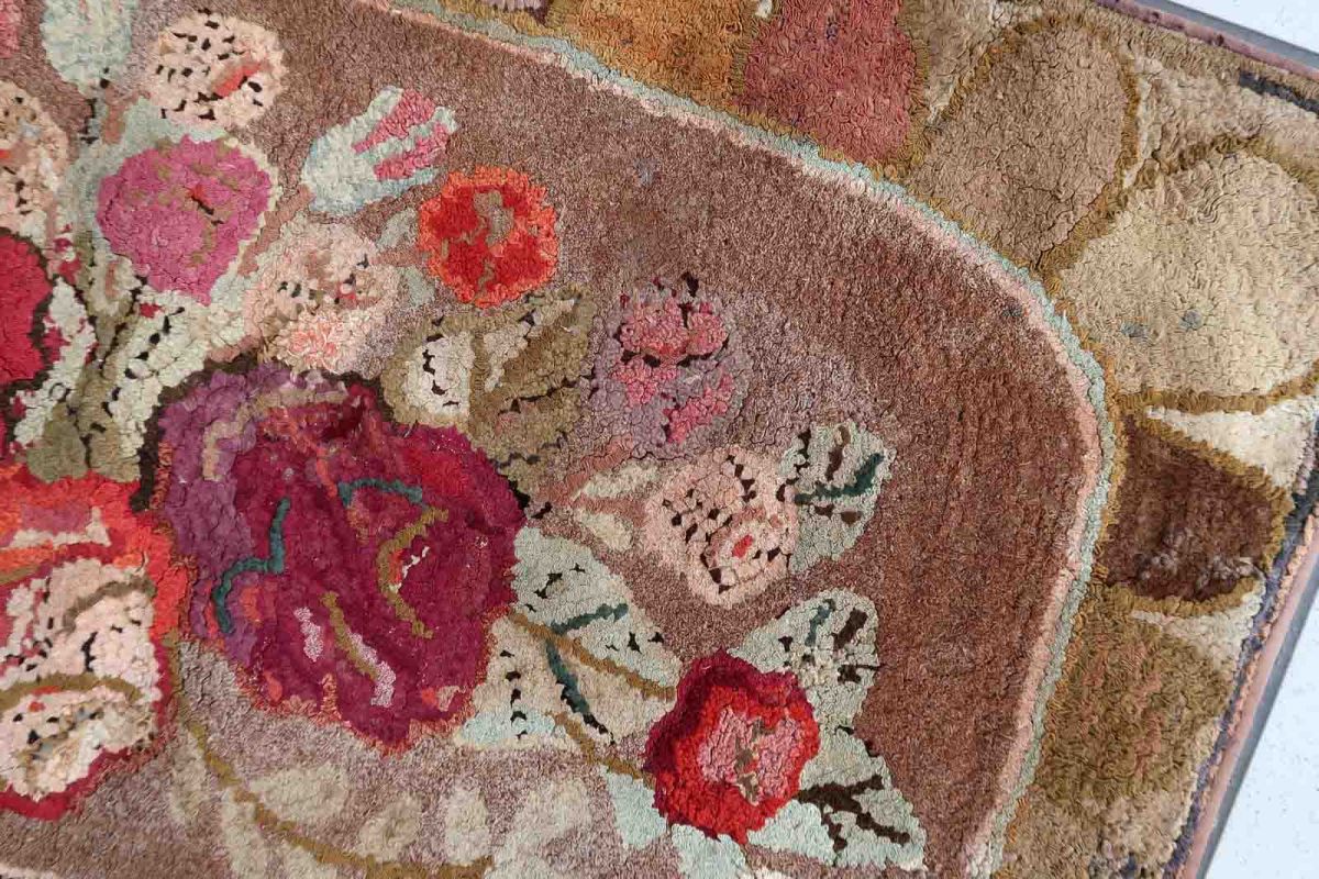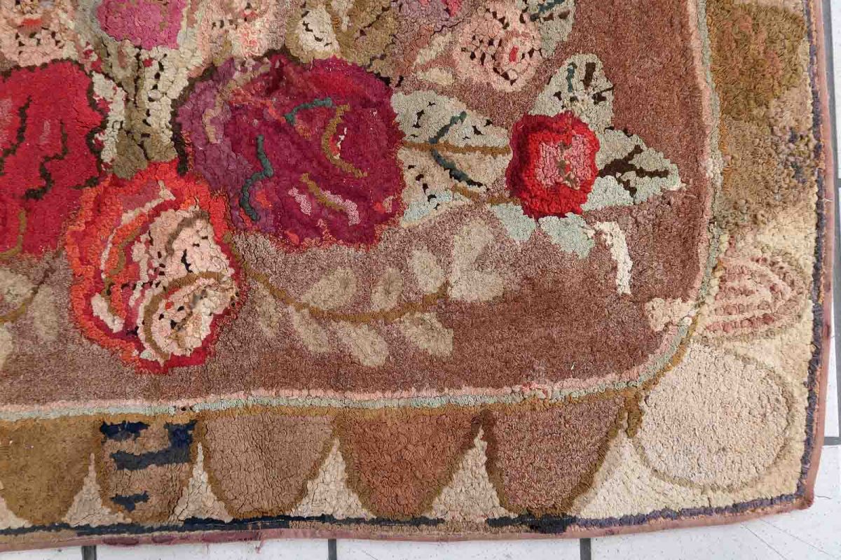 Handmade antique American Hooked rug in primitive floral design. The rug is from the end of 19th century. It has some old restorations, the back side has some old glue on it(we will cover it with fabric to make it stronger).