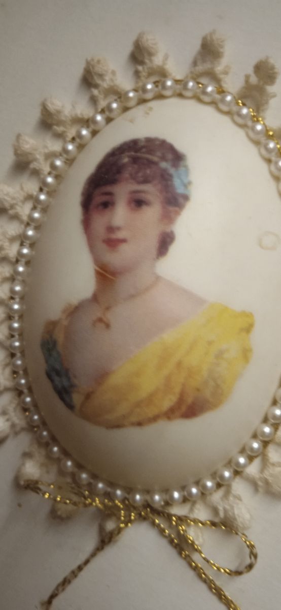 Une superbe image d'une dame peinte sur une véritable coquille d'œuf