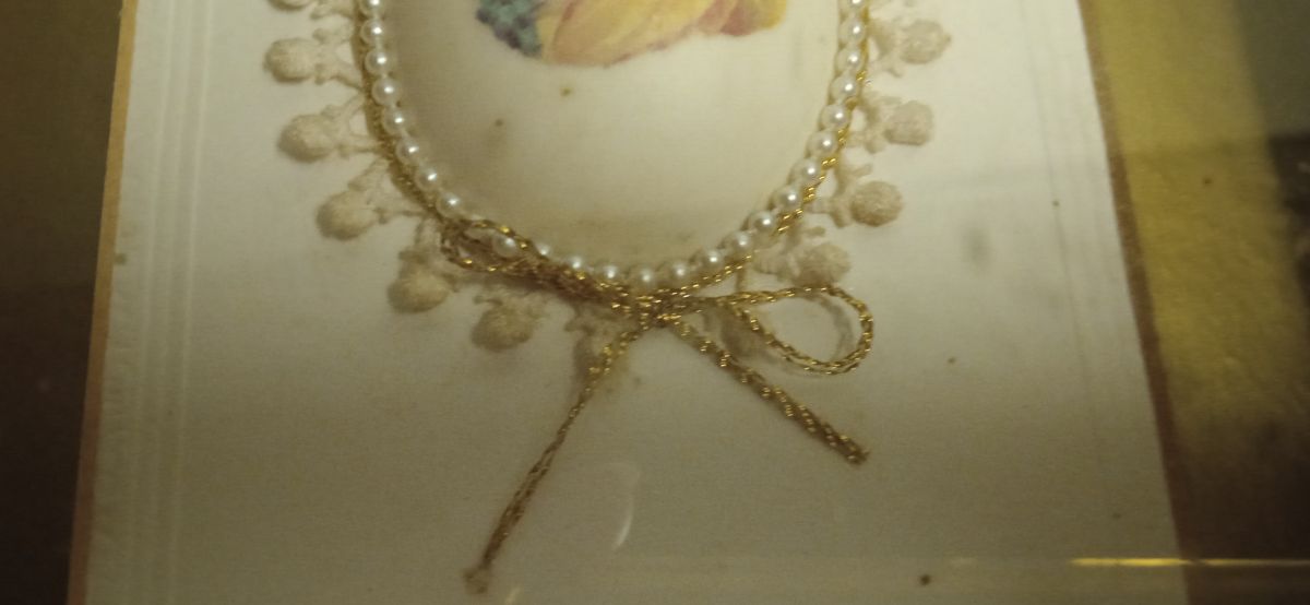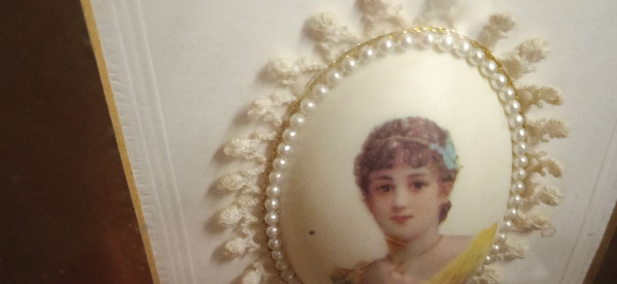 The half shell has bee carefully mounted and decorated with a surround of lace and beads. It was then installed into a 3D type frame.