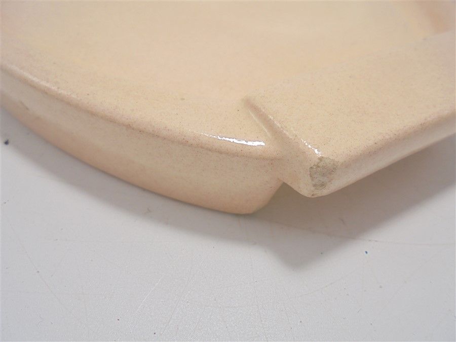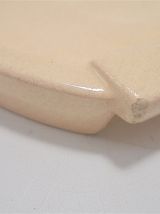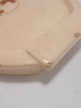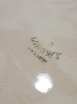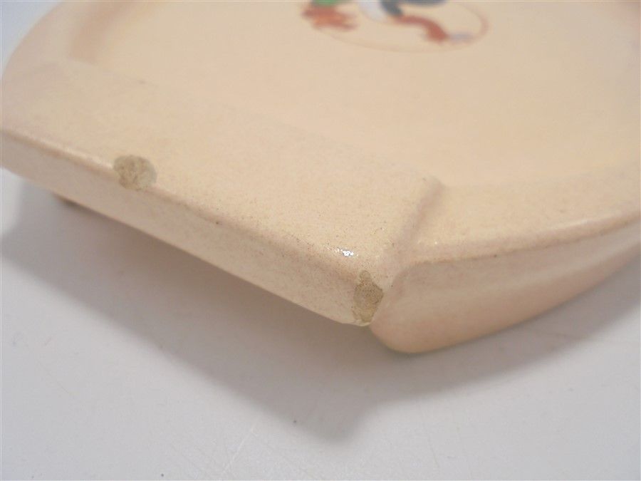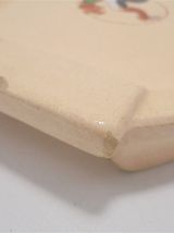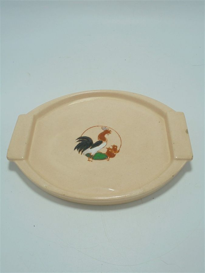 Mini plateau Longwy en céramique signée Longwy, au décor d'un coq et de 2 poussins sur fond rose pâle.
