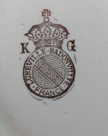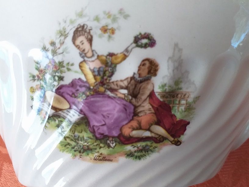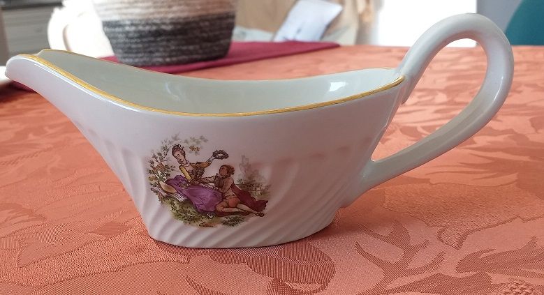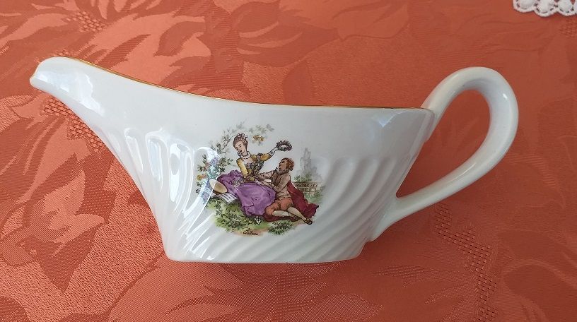 Très jolie saucière ancienne galbée et présentant un aspect de vagues. Décor de "Scène galante" signé Watteau. Filet doré sur la bordure et l'anse.