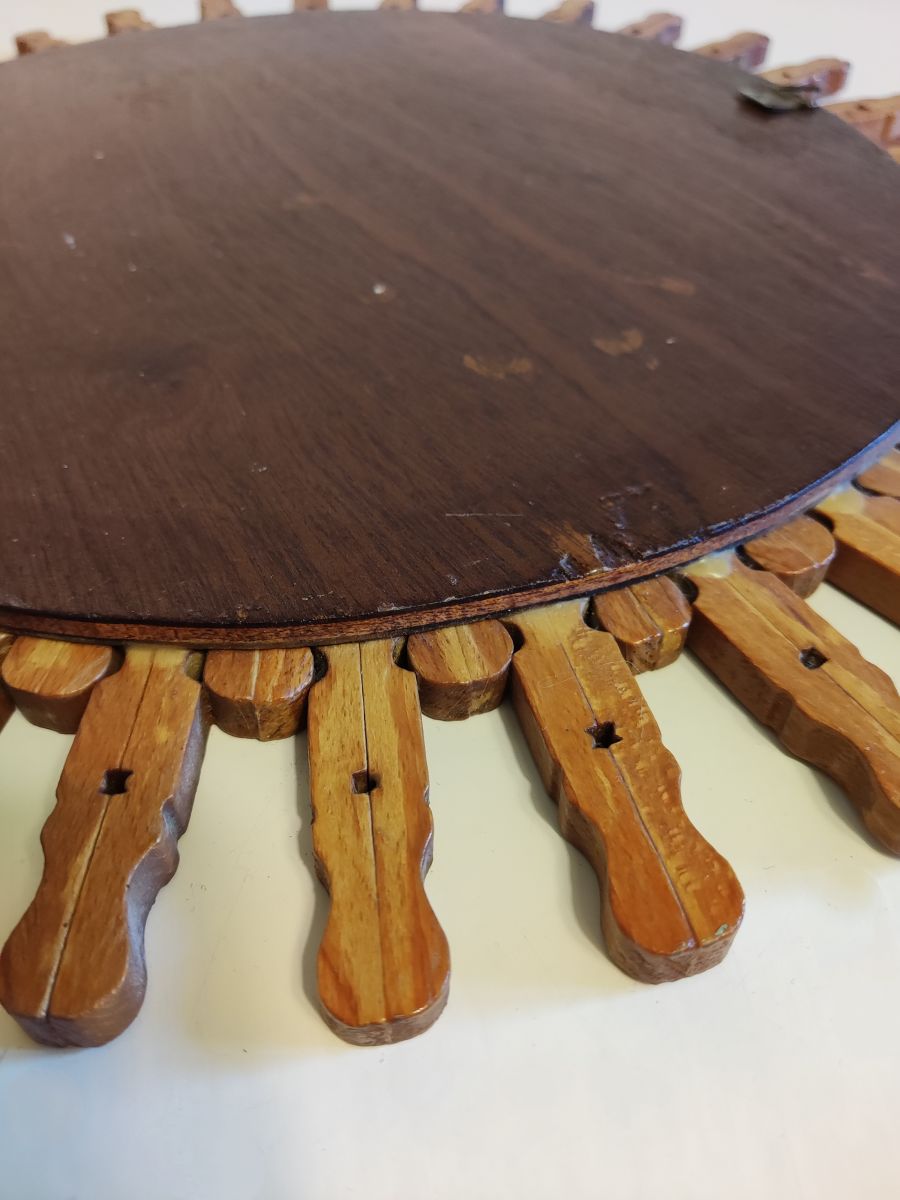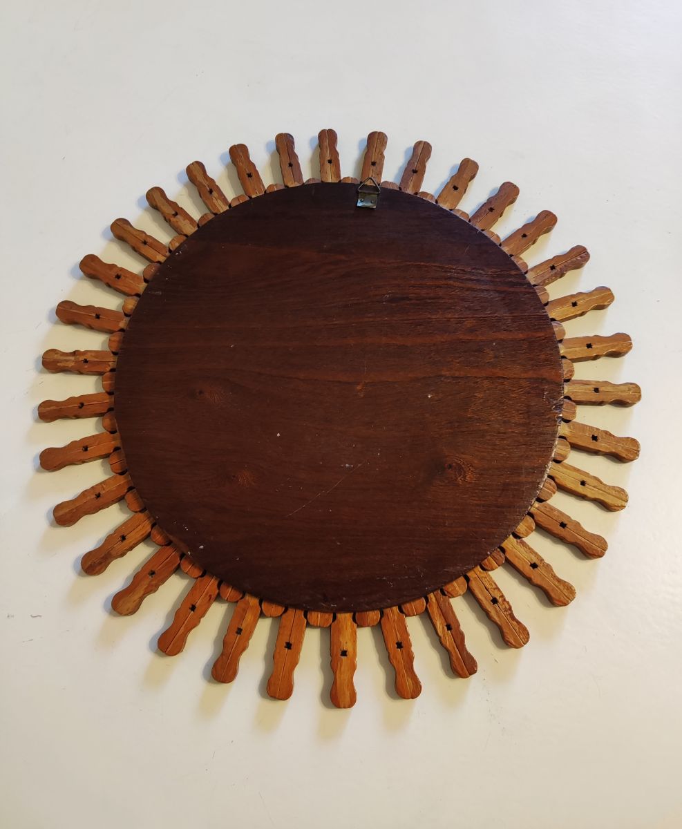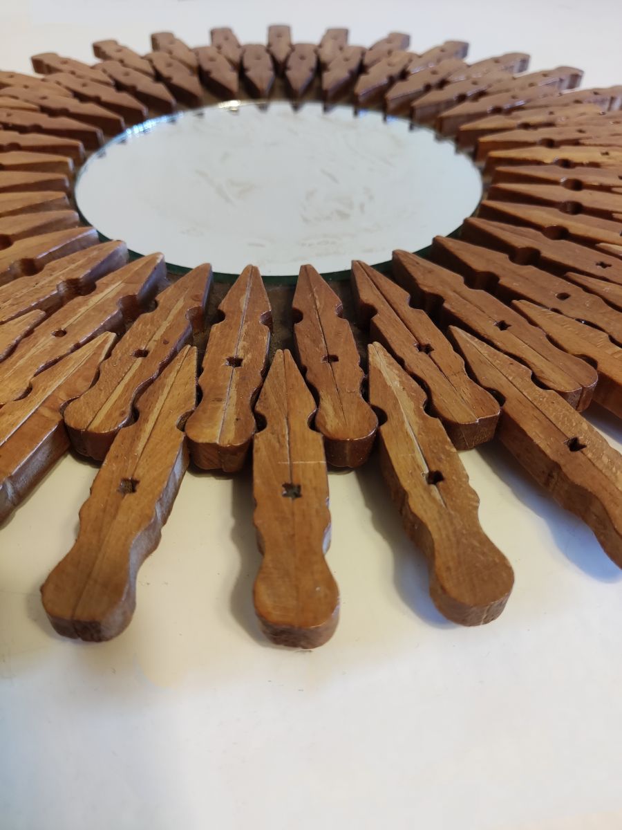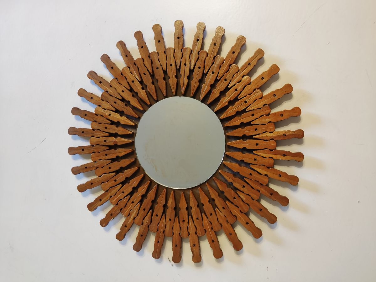 miroir soleil mural vintage en pinces à linge en bois avec crochet au dos des années 50
