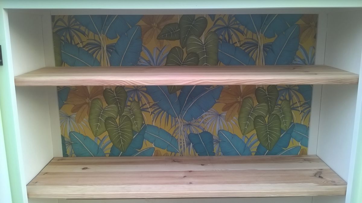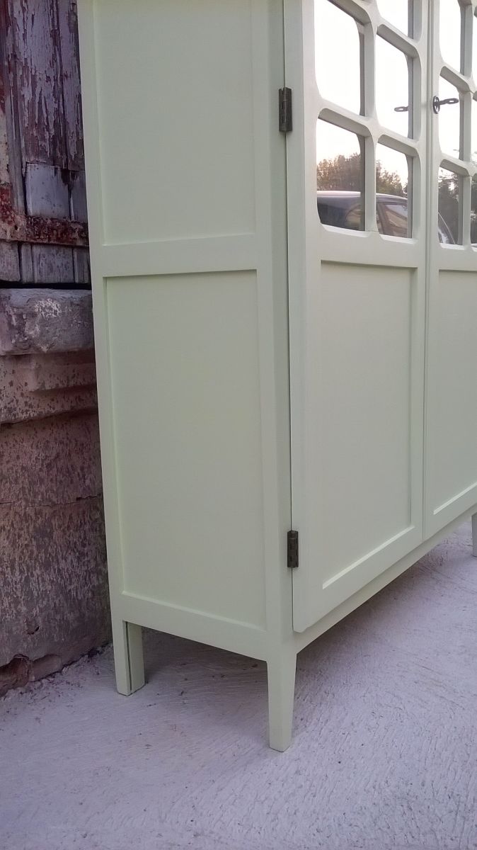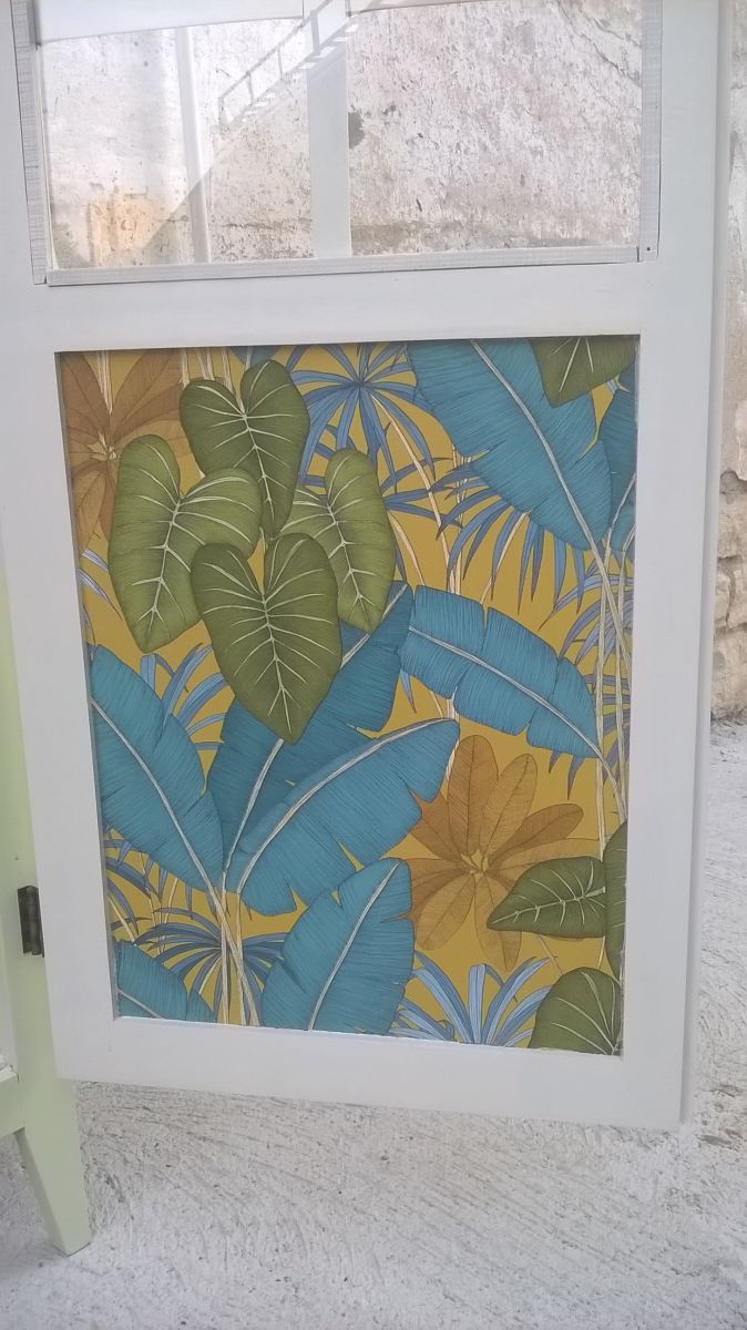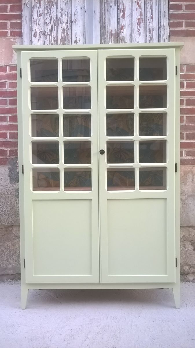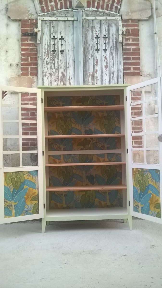 Armoire vitrine parisienne. Cette armoire a été poncer et repeinte en vert. L intérieur a été peint en blanc crème. Le fond et les portes on a été tapissé d un papier a décor de feuillages tropicale. Aménagée de quatre étagère sapin qui on été poncer. Hauteur totale 160.5 cm. Largeur 98 cm. Profondeur avec porte 35 cm.