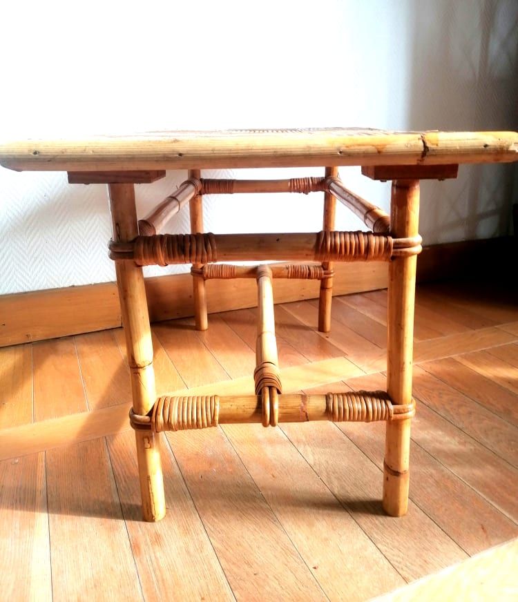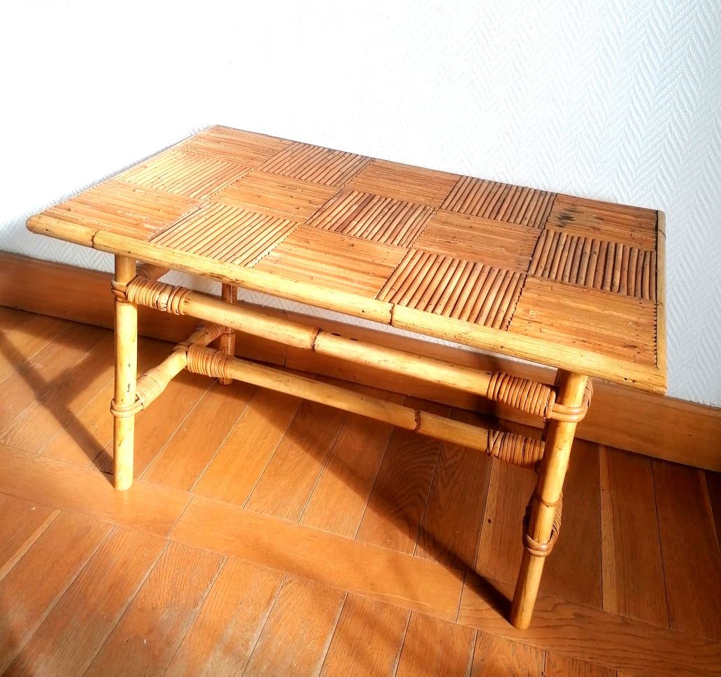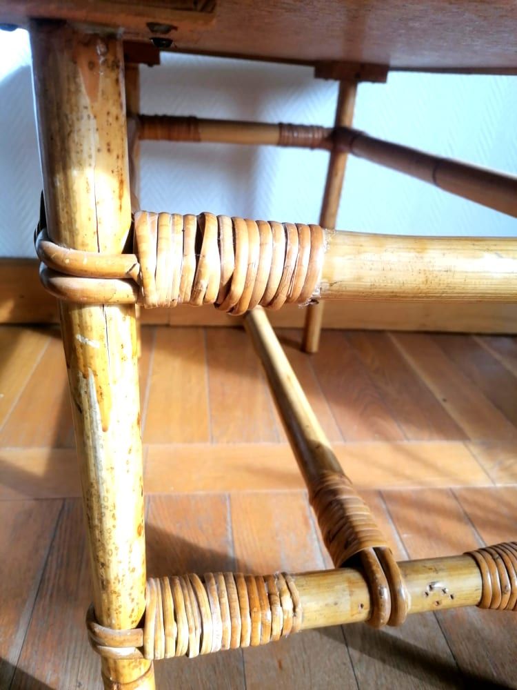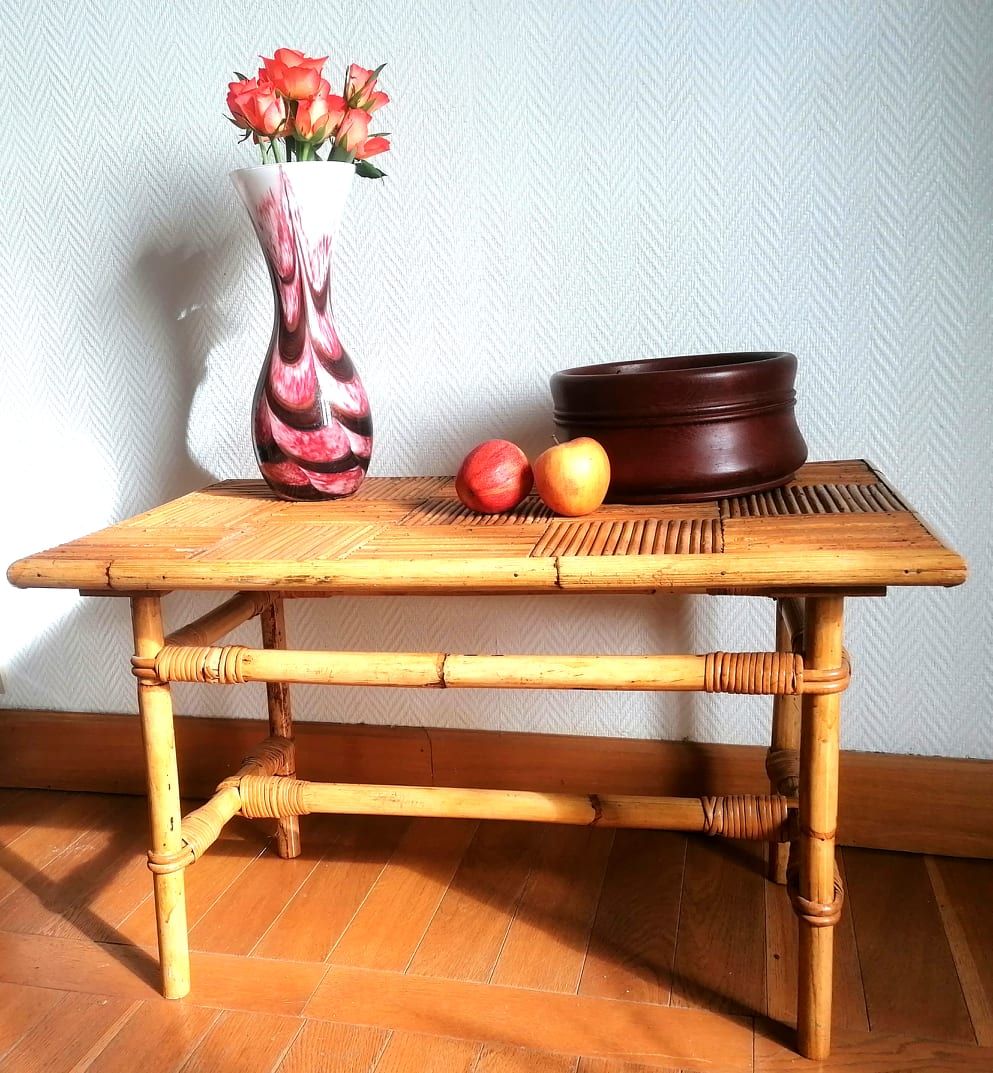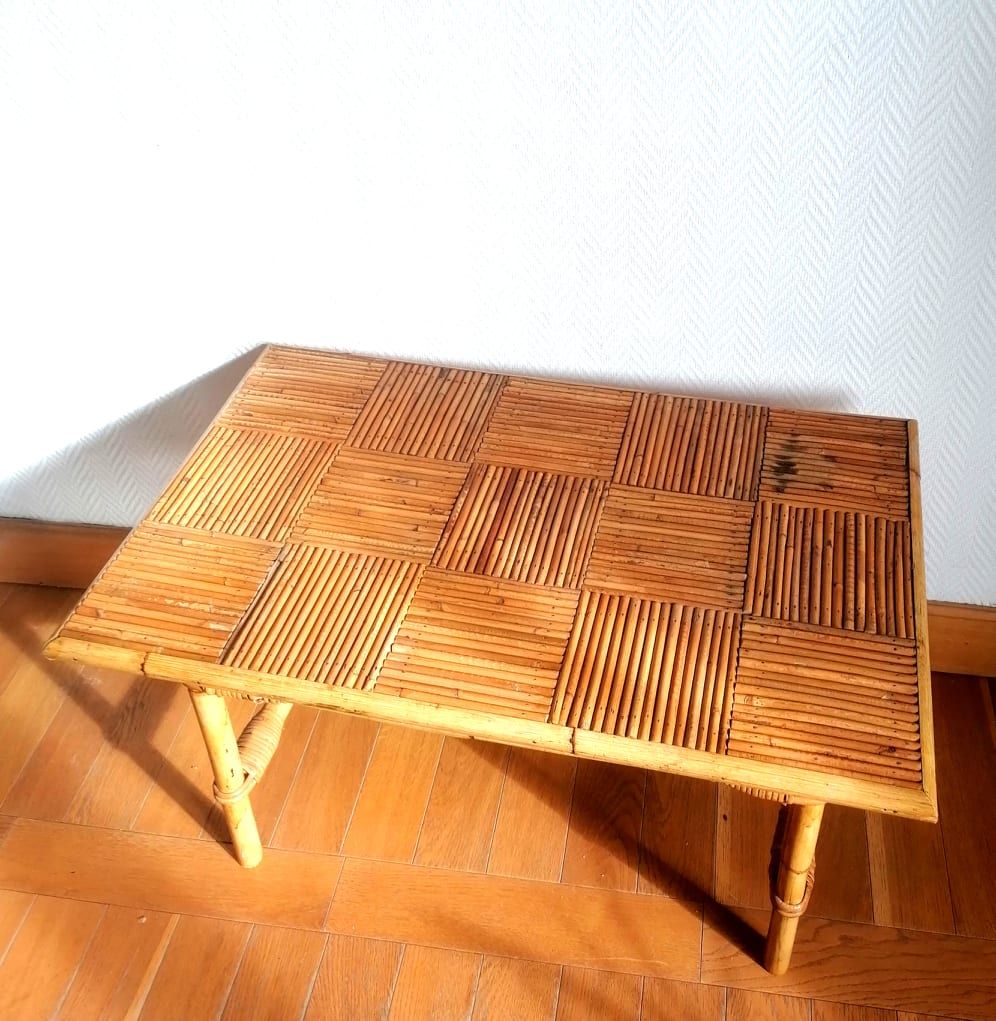 Table basse en bambou refendu et rotin, travail vintage des années 1960.
