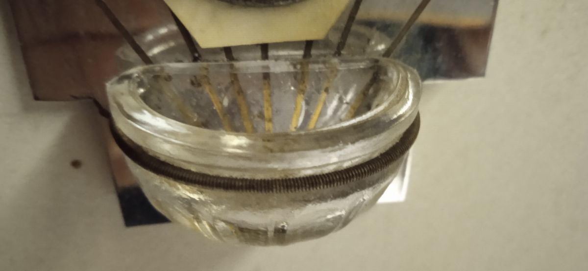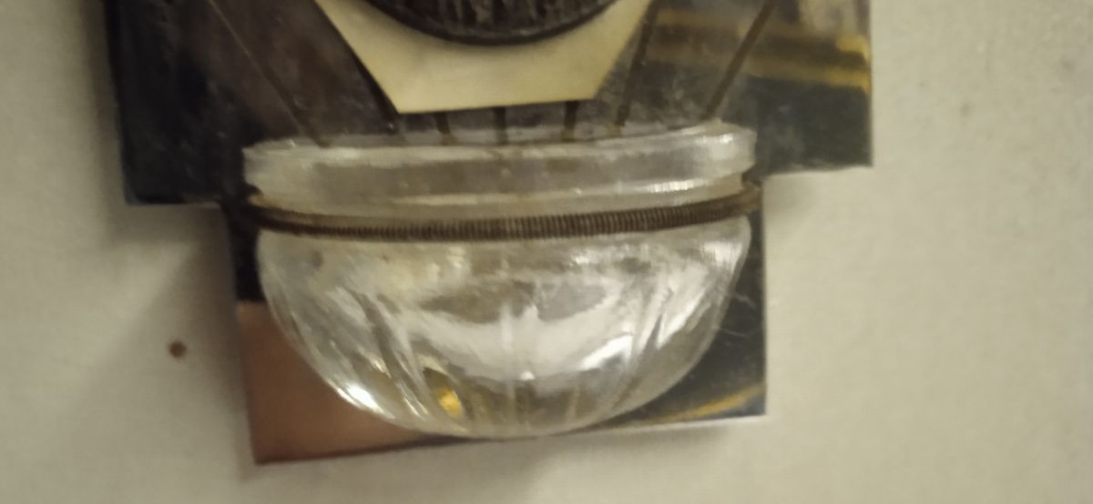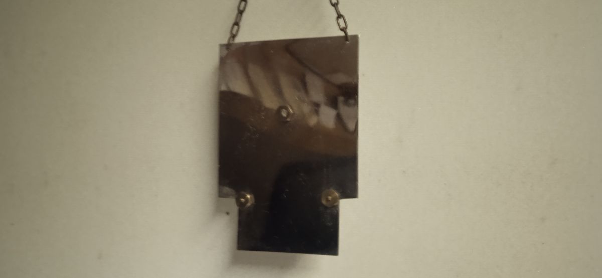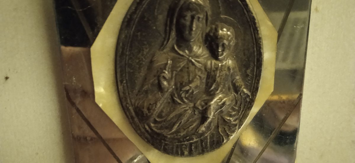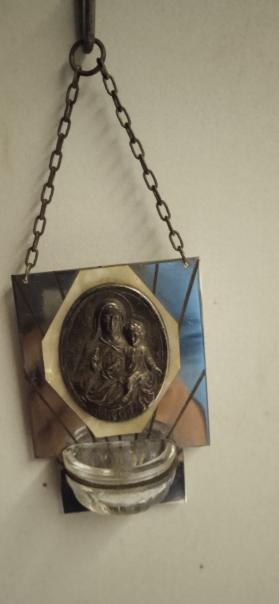 Forme en acier (ou en acier inoxydable ?) avec une image de Marie, la Sainte Mère et l'enfant Jésus. L'image est entourée d'un cadre en nacre et est au-dessus d'un petit bénitier en verre. Six lignes de laiton rayonnent de la base de la police. Au verso, il y a 3 vis et écrous en laiton - un au centre de l'image et un de chaque côté de la police. Le tout est suspendu par une chaîne en laiton.