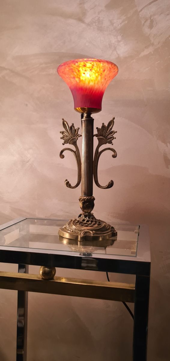 lampe bronze et laiton art nouveau , tulipe pate verre tres