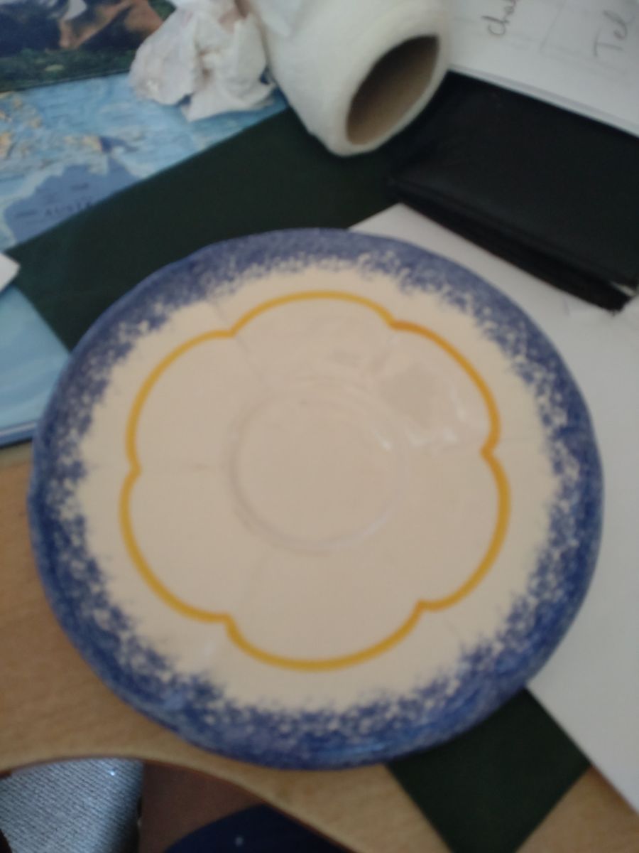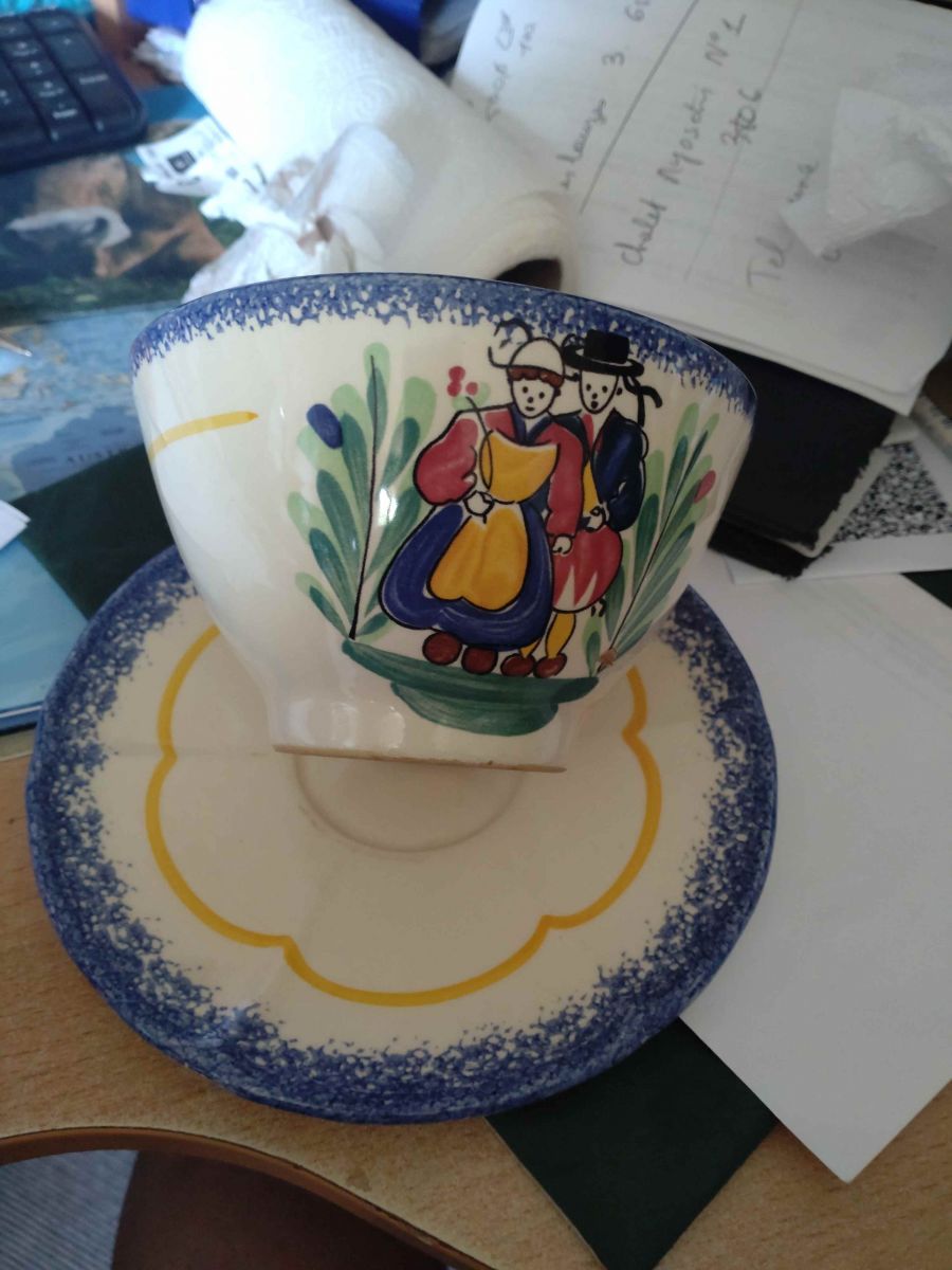 Ensemble bolée de cidre sans anse avec sa soucoupe Faïencerie de PORNIC Acheté à LA BERNERIE Peint main