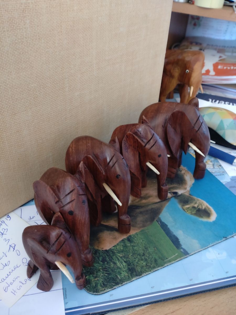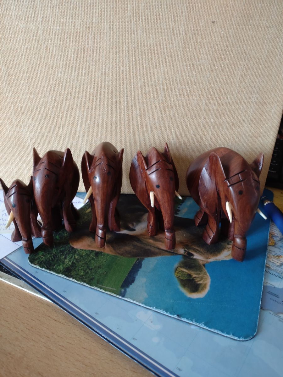 Famille complète de 5 éléphants sculptés en bois massif -. Acheté lors d'un séjour de 5 années au Sénégal. Hauteur du plus grand 9 cm et du plus petit 6 cm